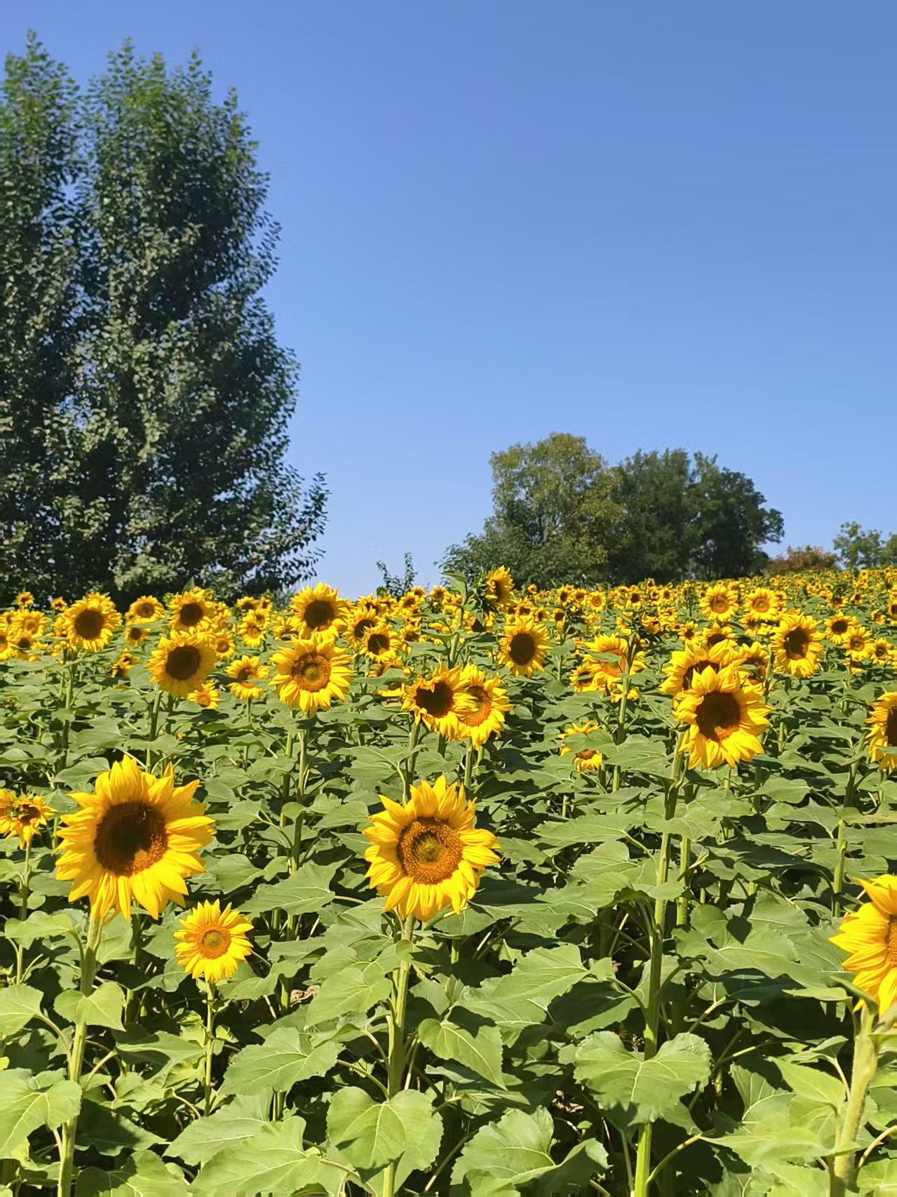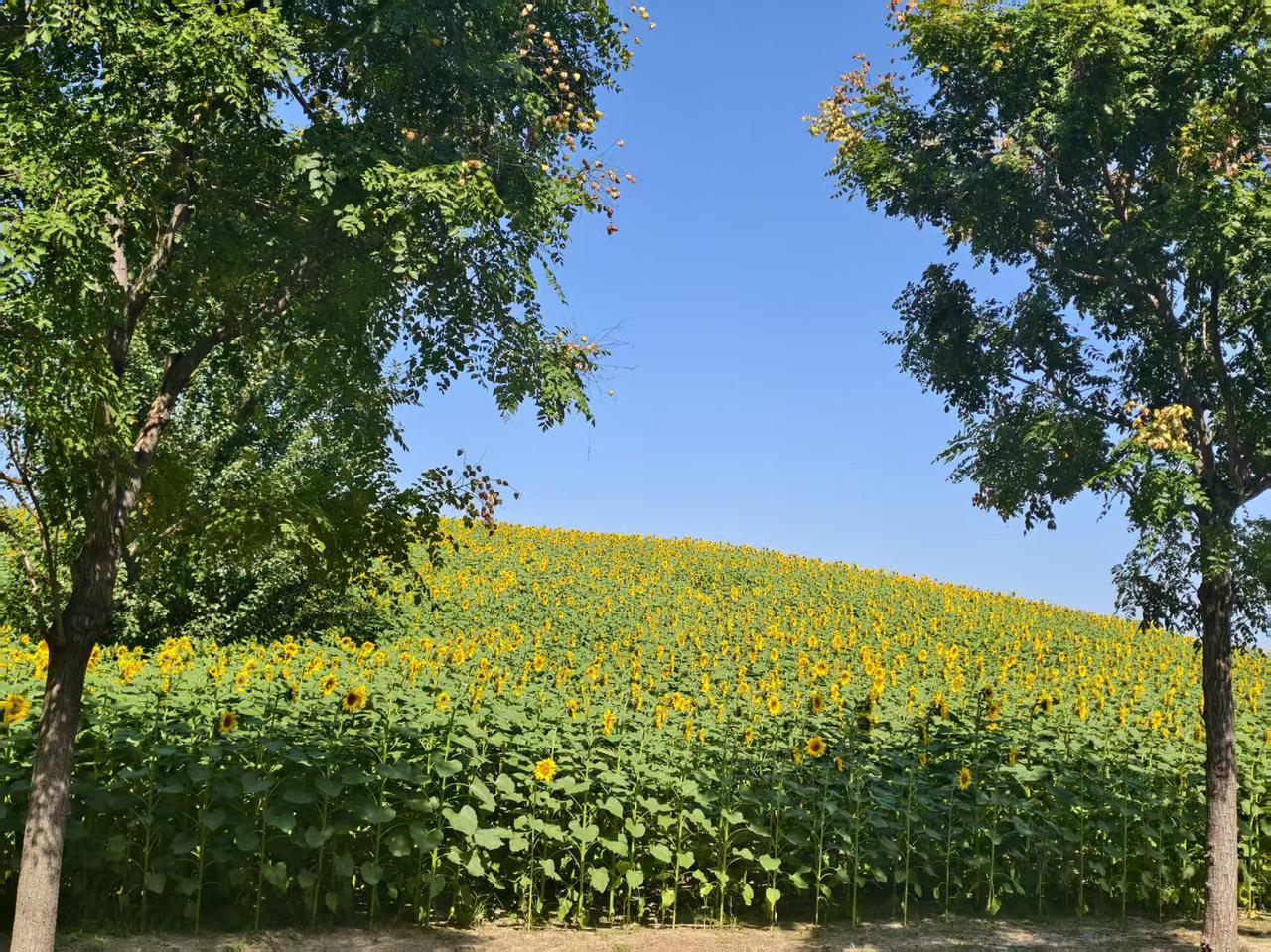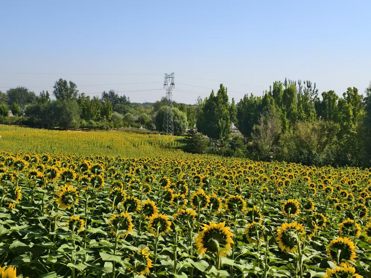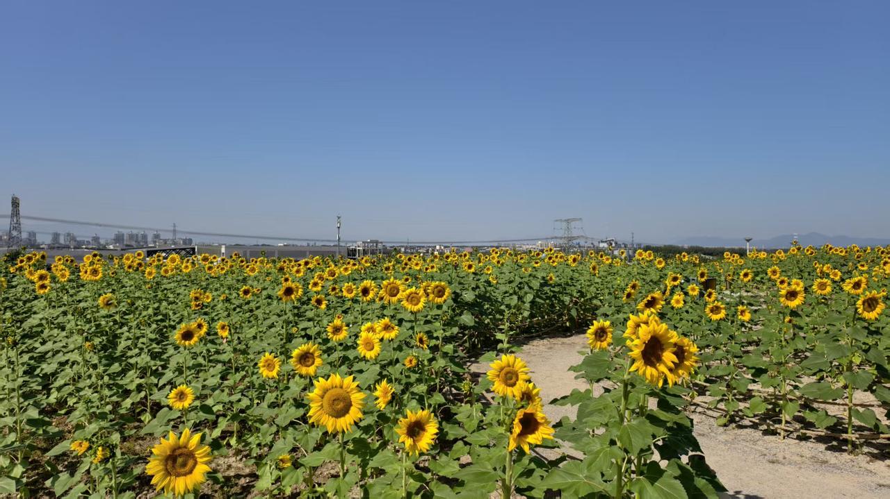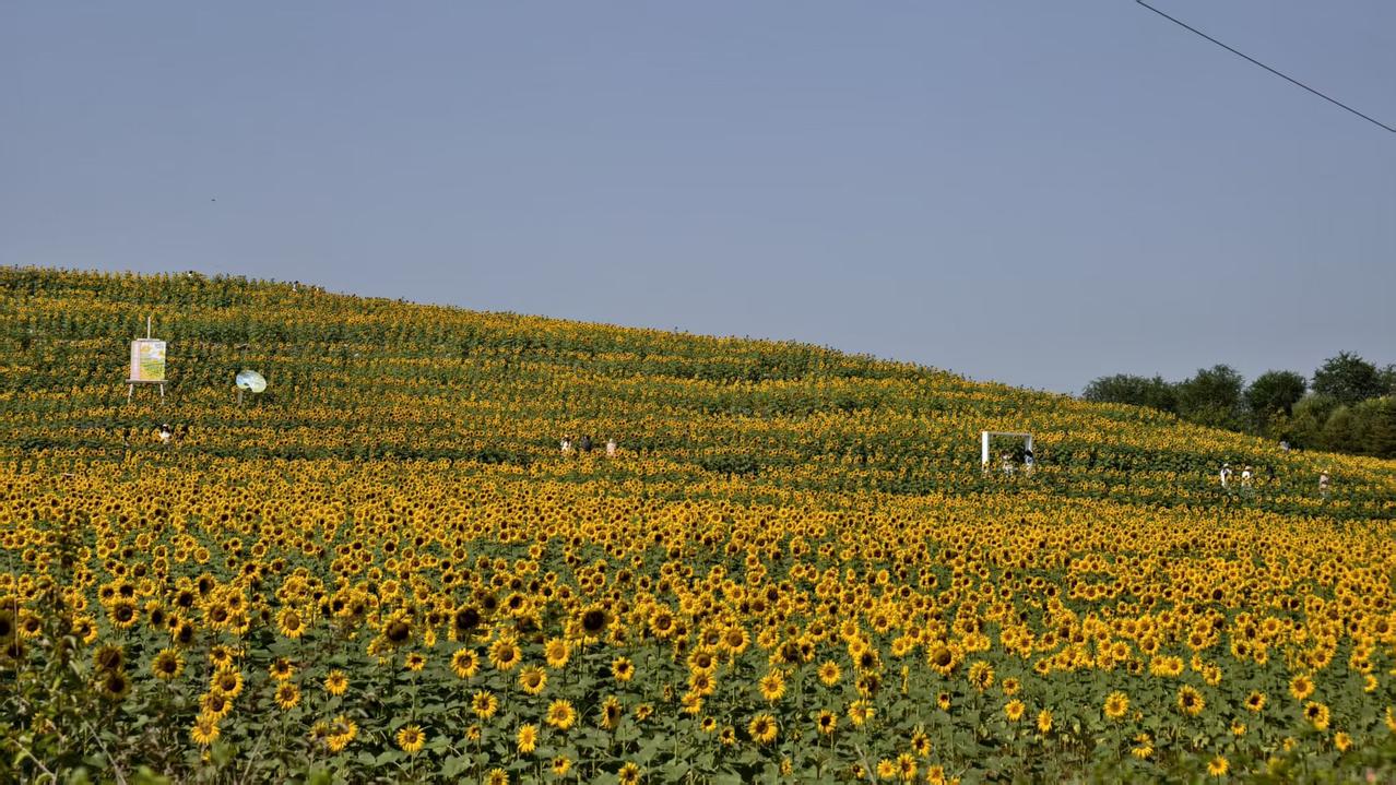 北京最大的公园,面积达30平方公里,国庆期间最大的看点,不为实际收获,只为眼球经济。 这就是温榆河公园。 正在盛开的向日葵覆盖了整个山坡。这个季节才开花的向日葵,注定不会有成熟的种子。仔细看了一下,确实不见种子。 烈日炎炎,前来赏花者络绎不绝,不过一定要做好防晒的防护。