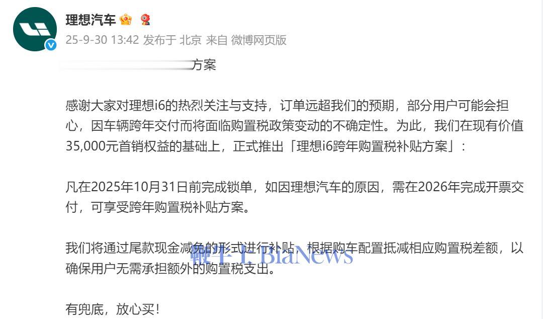 理想汽车官方发布理想i6跨年购置税补贴方案。