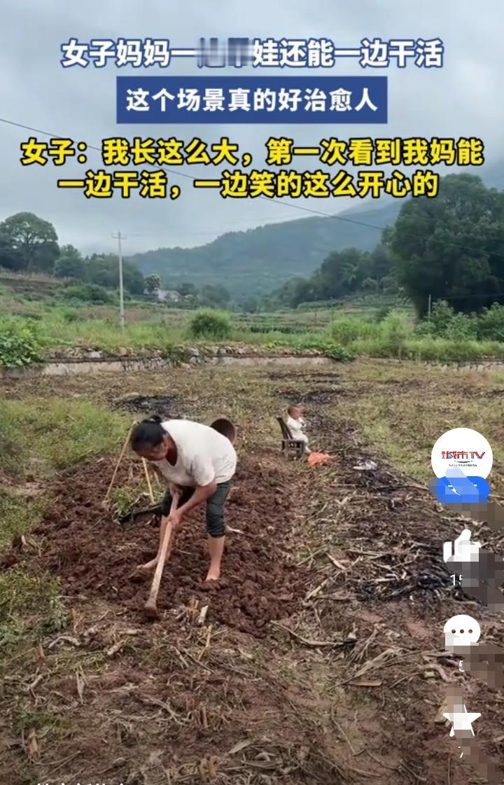 女子母亲一边带娃一边干活!这个场景真的好治愈人!女子称:没有带娃回去看她的时候,