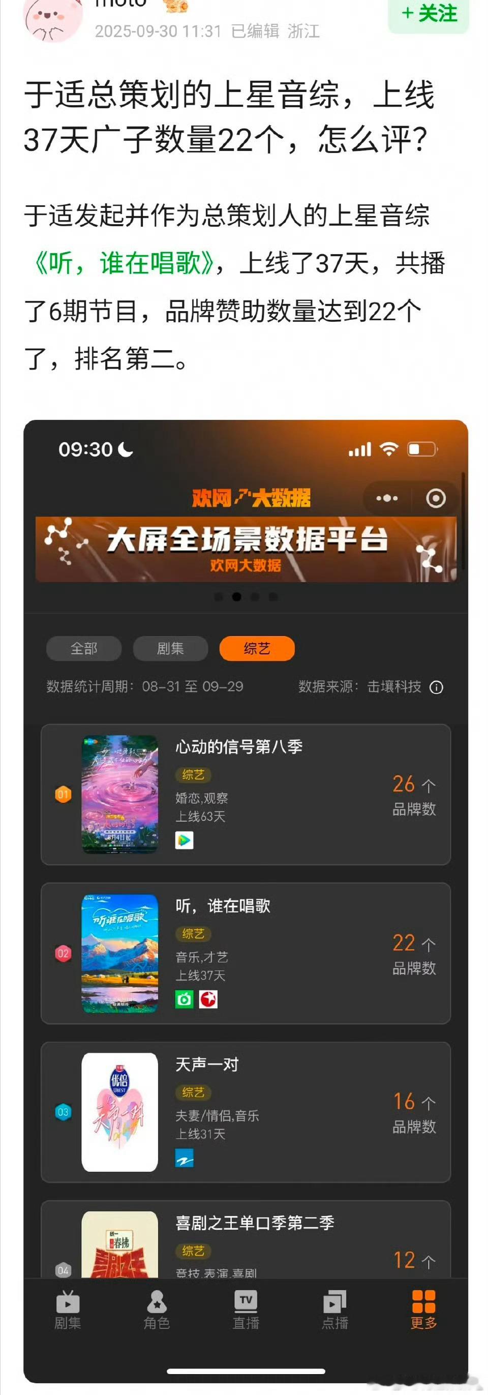于适总策划的上星音综,上线37天广子数量22个,号召力好强啊