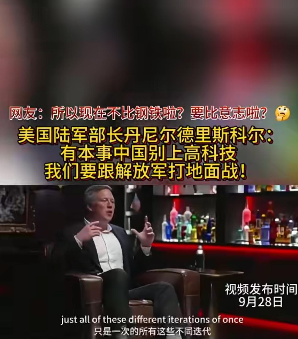 美国陆军部长丹尼尔德里斯科尔前两天在一个访谈里谈及未来会不会发生中美冲突的问题时直接表示: “中国人或许在技术上很厉害,但这会导致他们过度依赖技术。当战争真的打到地面决战时,我们的士兵和指挥官将依靠自己的素质和决策能力取得每一次胜利!” 当年美国人有钢铁,我们有钢铁意志:现在我们有了钢铁,他们强调意志了。可是我们的钢铁已经有了意志(无人机、机器人、无人坦克和无人艇)。