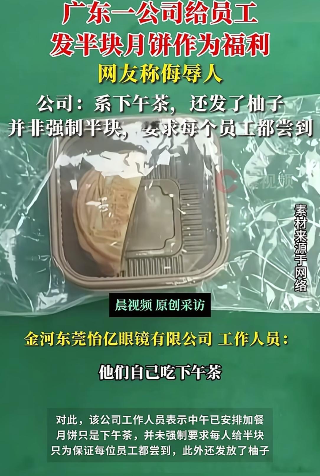 太侮辱人了! 有网友吐槽,“今年我们眼镜厂中秋节发半个月饼,一个柚子,太好笑”! 配图:被切的整整齐齐的半个月饼,还有一个柚子。 不少网友说,发半个月饼这简直是太侮辱人了,还不如不发! 而对于员工的吐槽,该眼镜厂的工作人员却回应这只是下午茶! 工作人员称“中秋节要来了,昨天中午就安排了加餐,下午就安排了个沙田柚给他们,还有分点月饼给他们,让他们自己吃个下午茶,我们是要求工厂每个员工都尝到。” 而对于这一回复,不少网友表示不买账!你这是安排下午茶的话还一人分一个柚子?说你抠你还给个柚子,说你大方你一次就给半个月饼... 不过,还有网友表示,自己公司更抠门,连半个月饼都看不到呢! 最后,对于这事你怎么看?你们公司中秋节发福利了吗?大家可以评论区晒晒~ 公司发月饼 中秋发员工福利