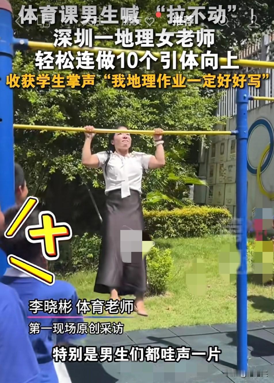 上学时要是有这老师 地理能考满分 深圳一地理女老师,体育课上男生喊引体向上“拉不动” 她直接穿着长裙高跟鞋上阵一口气做了10个 学生们当场看懵,掌声雷动,还有男生拍着胸脯说“我地理作业一定好好写” 我初中体育考引体向上拼了老命才拉了2个 要是当时有老师这么“实力示范”,我高低得逼自己多练几个 老师的魅力从不是板着脸讲课 这种用实力圈粉的操作,才是让学生真心服帖的秘诀 你上学时遇到过这么飒的老师吗?