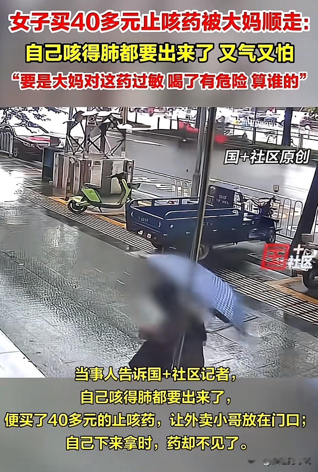 “真是无语到家了!广州一女子下雨天网购了止咳药,让骑手放门口,结果被一个大妈顺手拿走了!说真的,连药都有人拿,我是没想到的。 看监控,大妈捂得严严实实,东张西望几下,快速把药拿走了。女子白白损失四十多块钱,还得重新买,更麻烦的是,那药是按医生开的方子买的,万一大妈乱吃出事,那可太吓人了。 网友也气坏了:“这大妈是不是偷东西上瘾?连药都敢拿,简直是在玩命!” 说实话,我觉得这种人就是占小便宜占习惯了。今天拿包纸,明天拿个快递,后天就敢顺手摸走别人的药,底线就这么一点点没了。要我说,小恶不改,迟早会酿成大错。 别让贪小便宜像癌细胞一样扩散。每次伸手都在消耗人与人之间的信任,每句“这又不值钱”都在破坏大家的规矩。底线这东西,一旦突破就回不去了,咱们都得从拒绝第一次诱惑开始。