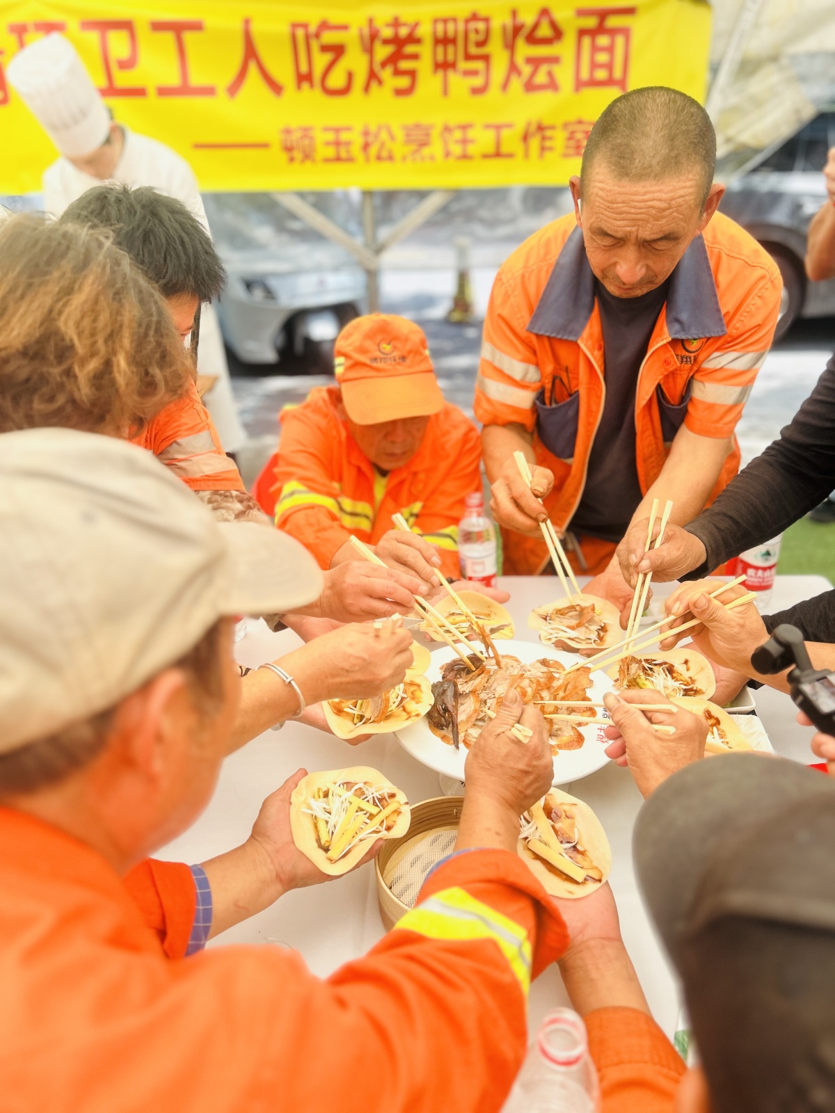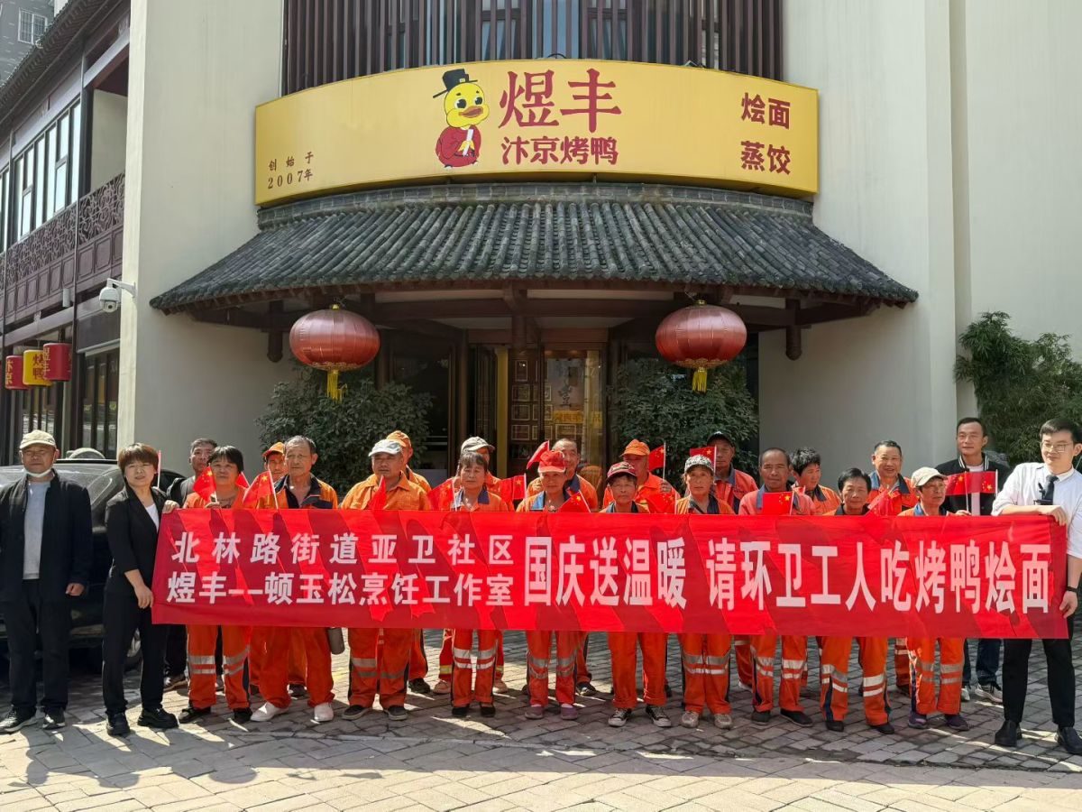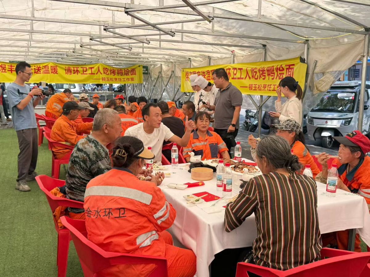 9月30日中午,国庆假期前夕,当多数人已满怀期待开启休假模式,众多环卫工人仍坚守岗位,以"宁愿一人脏,换来万人洁"的担当守护着城市洁净。当日,煜丰餐饮举办"国庆吃面,国泰民安"公益活动,邀请一线环卫工人共享特色汴京烤鸭与羊肉烩面,用热气腾腾的家乡味为劳动者送上节日关怀。
