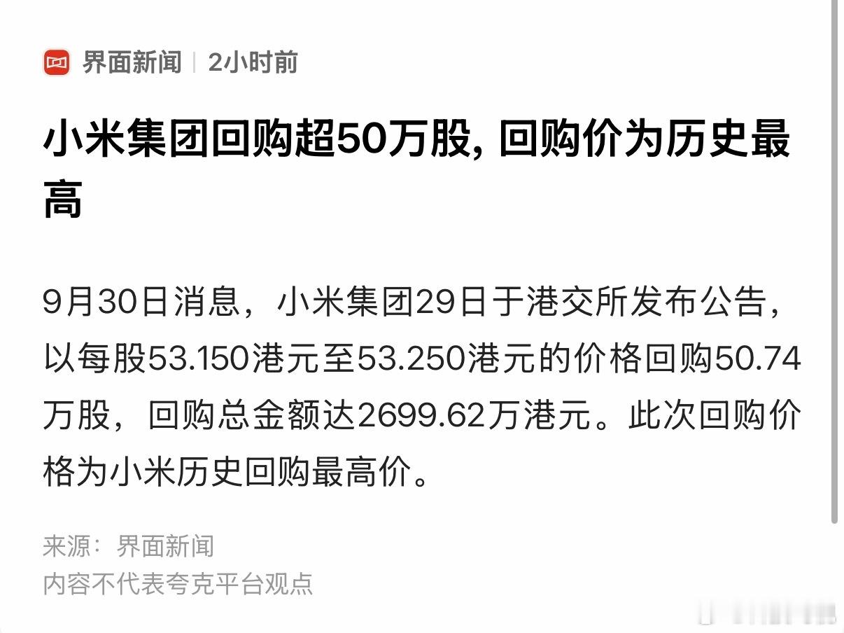 小米斥资2700万港元回购50.74万股B类股份 小米17发布后总有人拿小米股价来说事,现在官方的回应来了。2700万回购50.74万股B类股份,每股回购价超53港元,非常高的价格。说明小米内部是非常有信心的,无论是小米17还是汽车业务都在稳步推进。妄图用空穴来风的消息唱衰小米,做空小米,绝无可能。不信我们就等着看吧,没理由一直跌的[笑而不语]