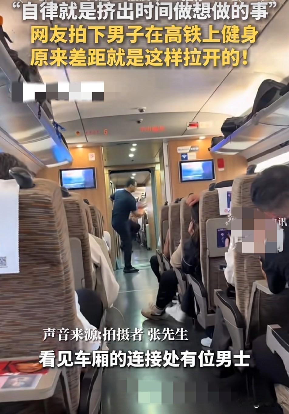 高铁上这大叔把“自律”玩明白了 别人赶路要么刷手机要么补觉 他倒好 在车厢连接处拉伸、活动 还说“自律就是挤出时间做想做的事” 我每次坐高铁,零食炫到停不下来,人家却把碎片时间用来健身 有网友笑“这差距,是健身和躺平的鸿沟” 也有人夸“这才是时间管理天花板” 你赶路时会偷偷卷起来吗?