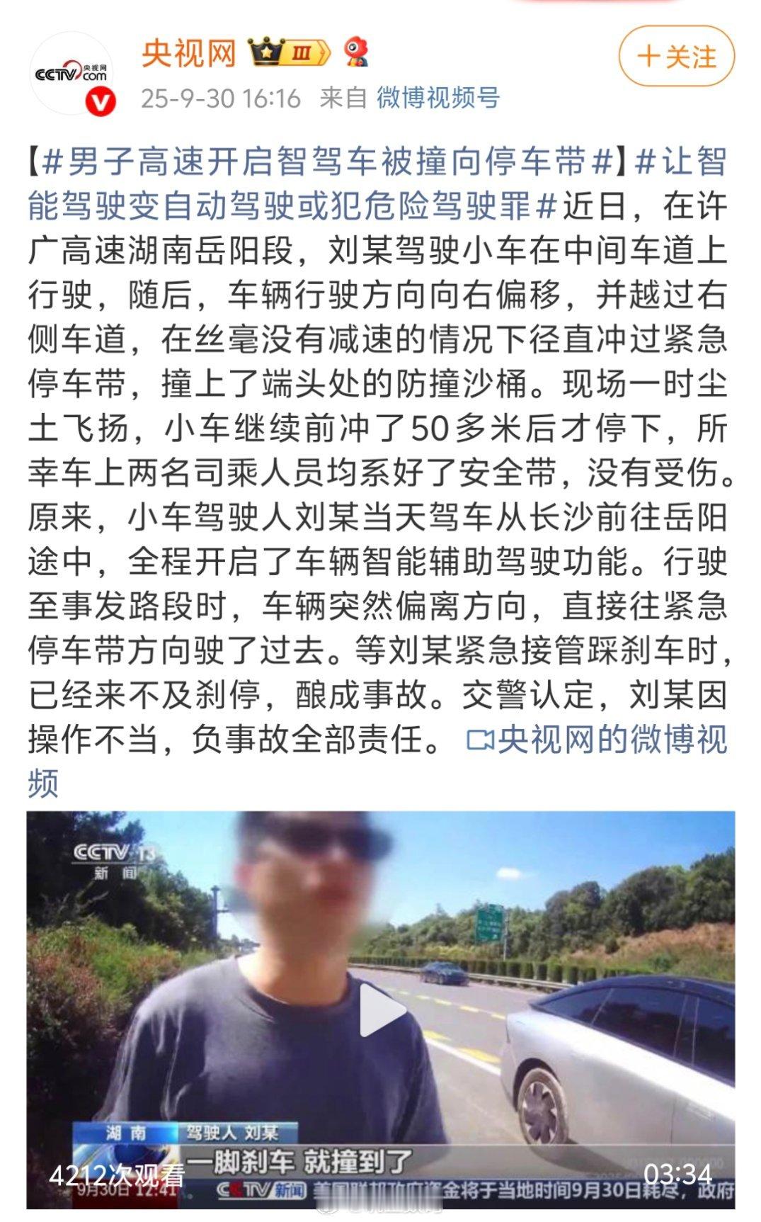 男子高速开启智驾车被撞向停车带央视再次提醒,现在的智驾只是辅助驾驶,驾驶员是第一责任人。那些还在说什么,车开好过人开的,智驾开车睡觉的、酒驾智驾的,都建议回自己家客厅里用智驾[二哈]