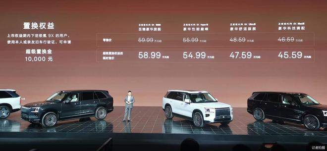 9月29日晚,极氪9X正式上市,该车型推出Max版、Ultra版、Hyper版、曜黑版共计四个版型,官方零售价为46.59万—59.99万元,超级置换权益后限时售价为45.59万—58.99万元。