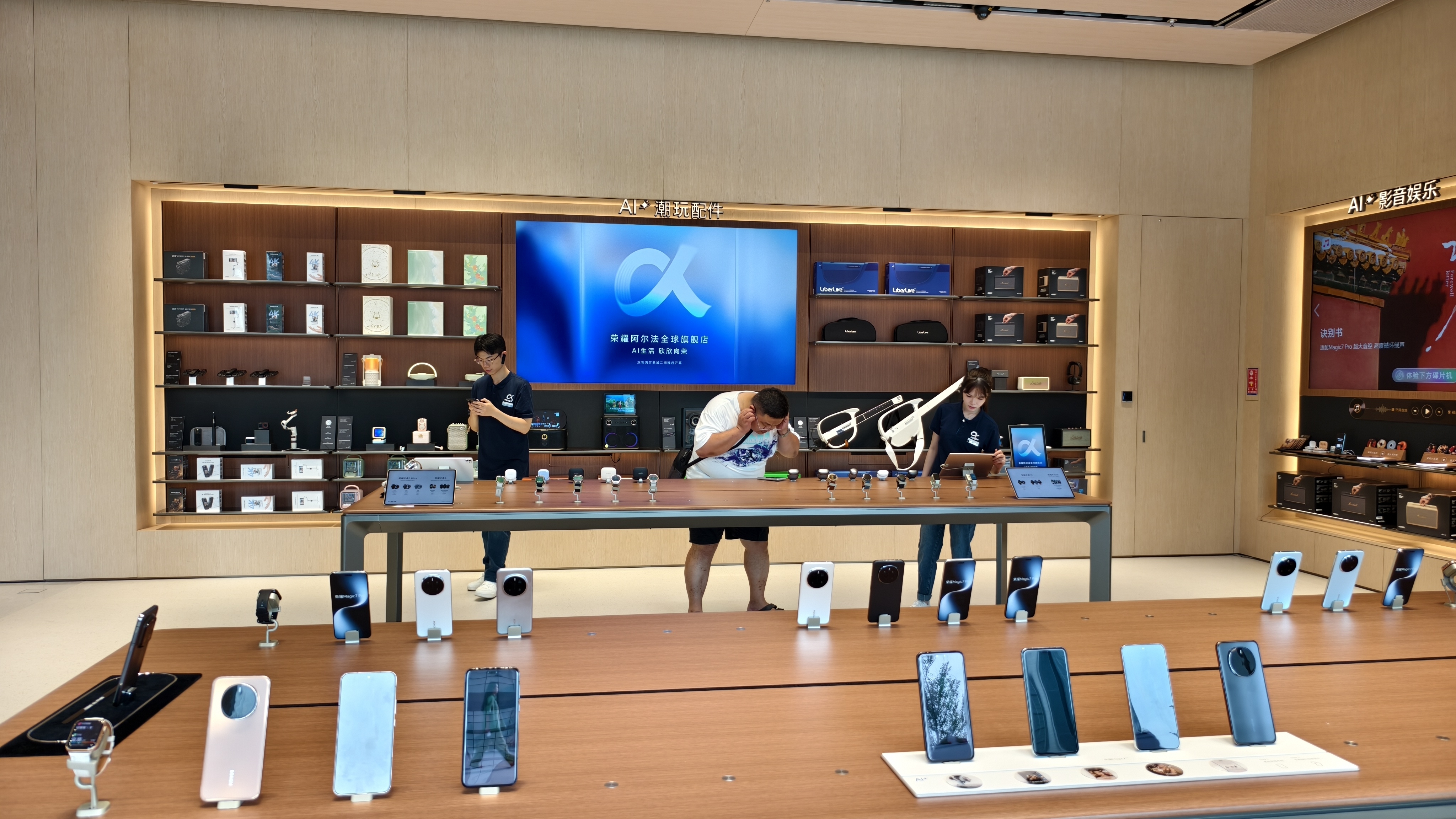 今年3月,荣耀发布阿尔法战略,宣布从智能手机制造商向全球领先的AI终端生态公司转型。开业当天,荣耀CEO李健现身该旗舰店。他在发言中表示,荣耀阿尔法全球旗舰店的开业不仅是荣耀阿尔法战略落地的重要里程碑,更是携手产业伙伴共同迈向未来AI智慧生活的新起点。