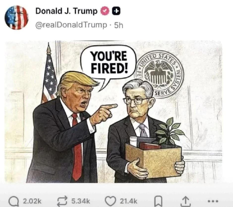 特朗普社交媒体发AI图"解雇"鲍威尔,实为政治施压。鲍威尔任期至2026年5月,法律禁止总统随意解雇。特朗普不满其降息缓慢,要求更大幅度降息,鲍威尔坚持独立决策。此事件凸显美国政治与金融体系独立性的重大考验,若美联储独立性受损,将严重动摇市场对美国经济政策的信心,影响全球金融稳定。