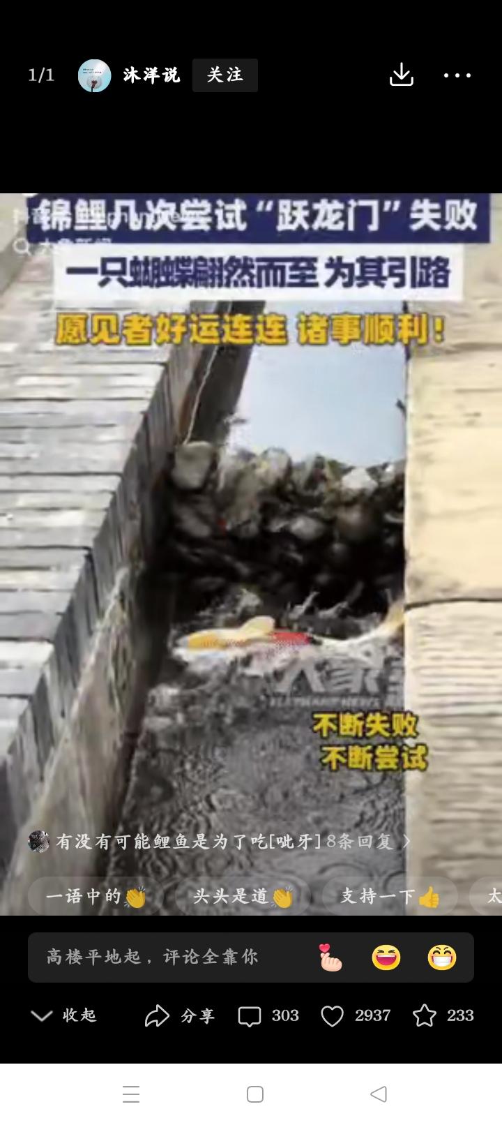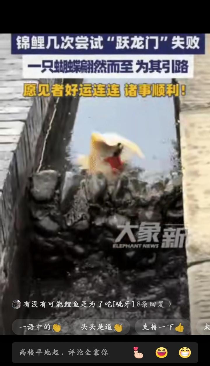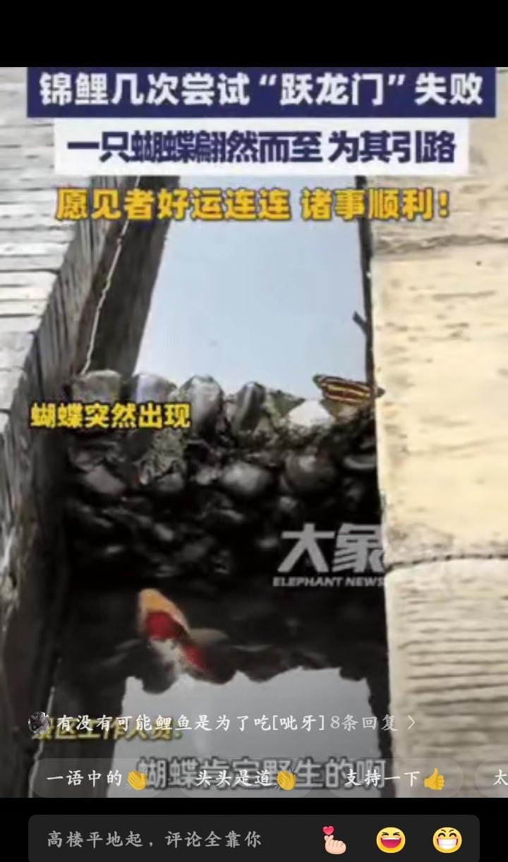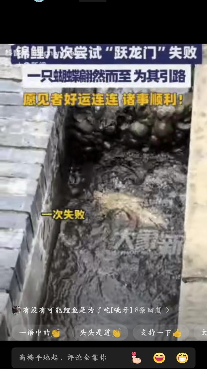 彻底解释不清了!”一条锦鲤几次尝试“跃龙门”,结果都失败了,就在这时,突然一只蝴
