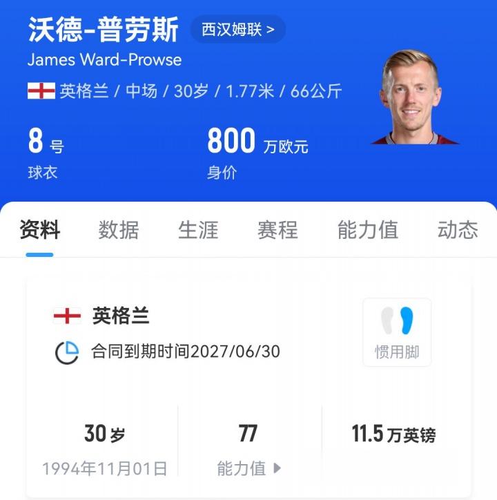 沃德-普劳斯目前的德转身价为800万欧元,他因擅长定位球而闻名;目前他与西汉姆的合同将在2027年到期。