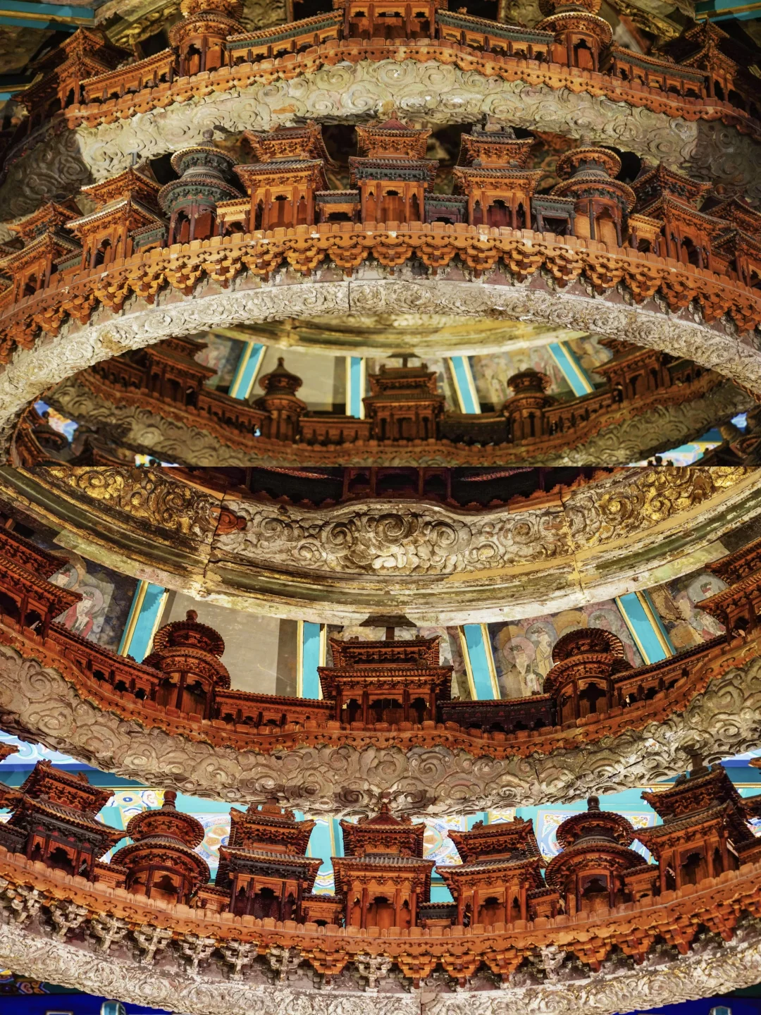 🔹共六层立体结构:每层主框架上均细雕云纹图案,楼阁、仙宫、星宿。142颗金色木雕星宿可手动旋转