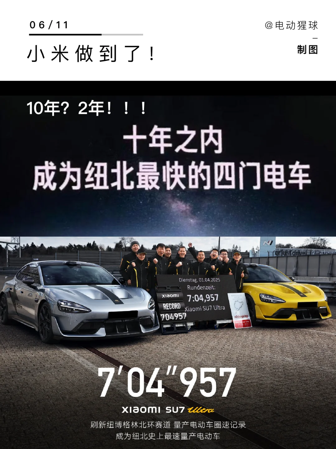 ⚡️7分04秒957,小米SU7 Ultra🏆登顶纽北最速量产电动车,雷总他做到了!!