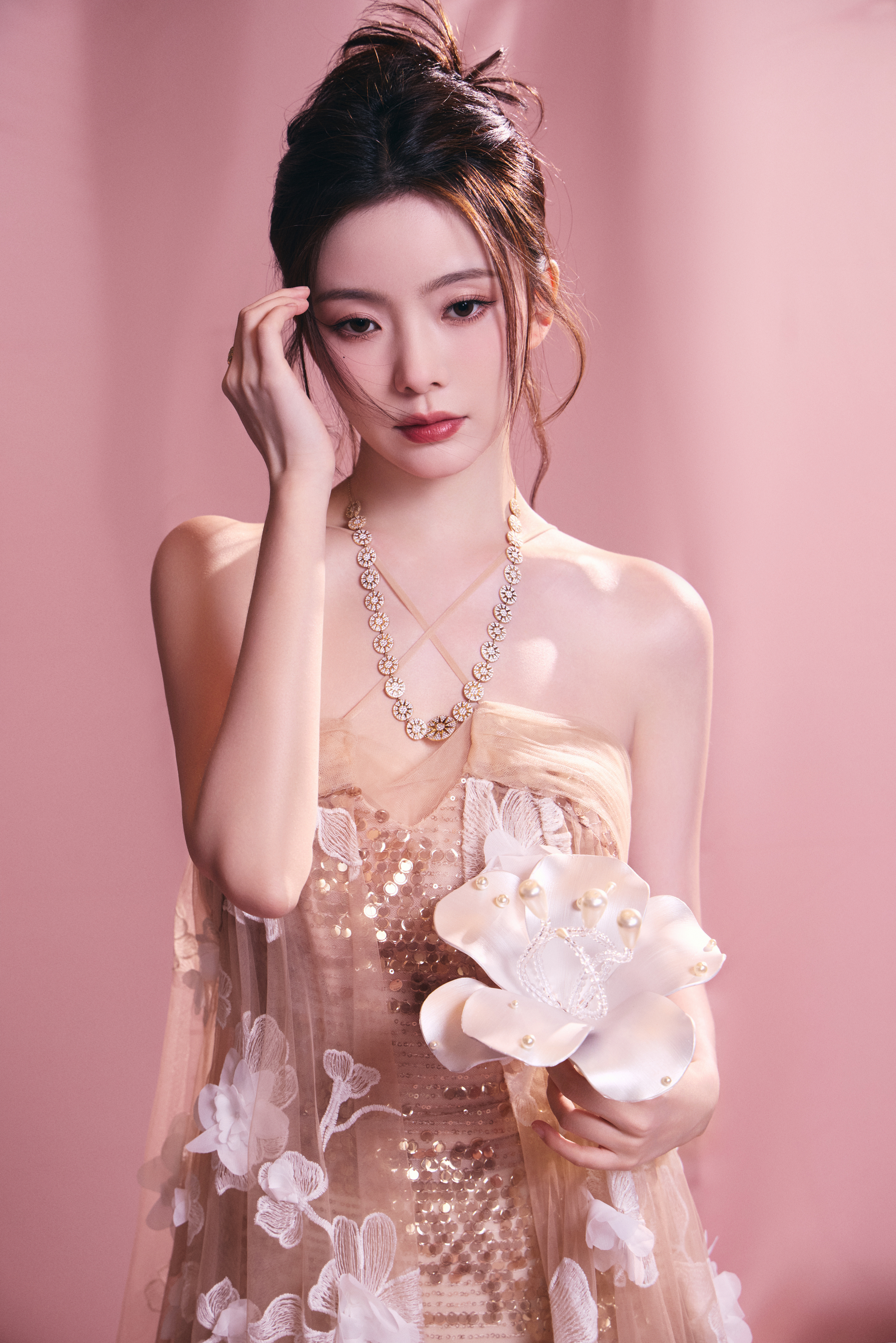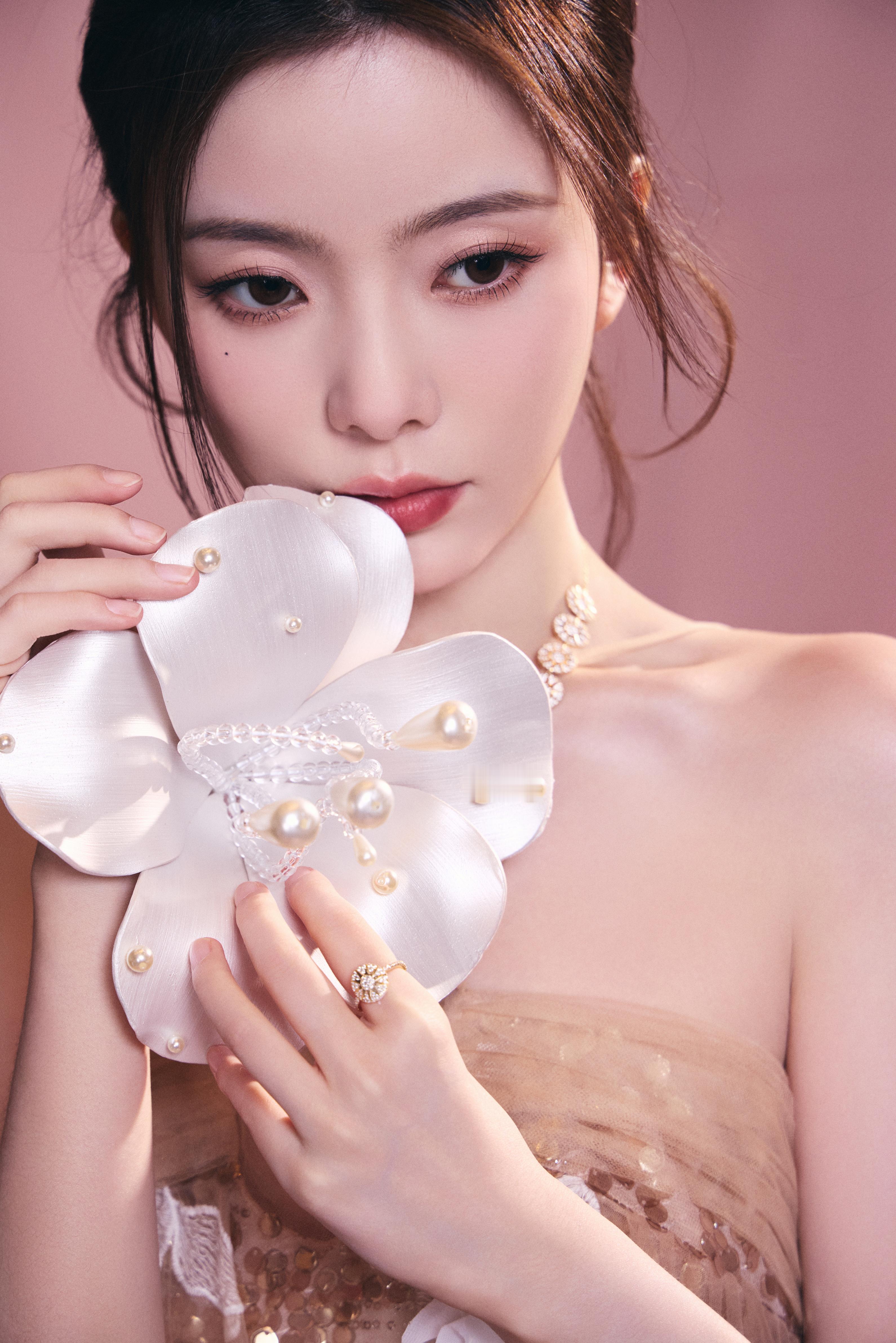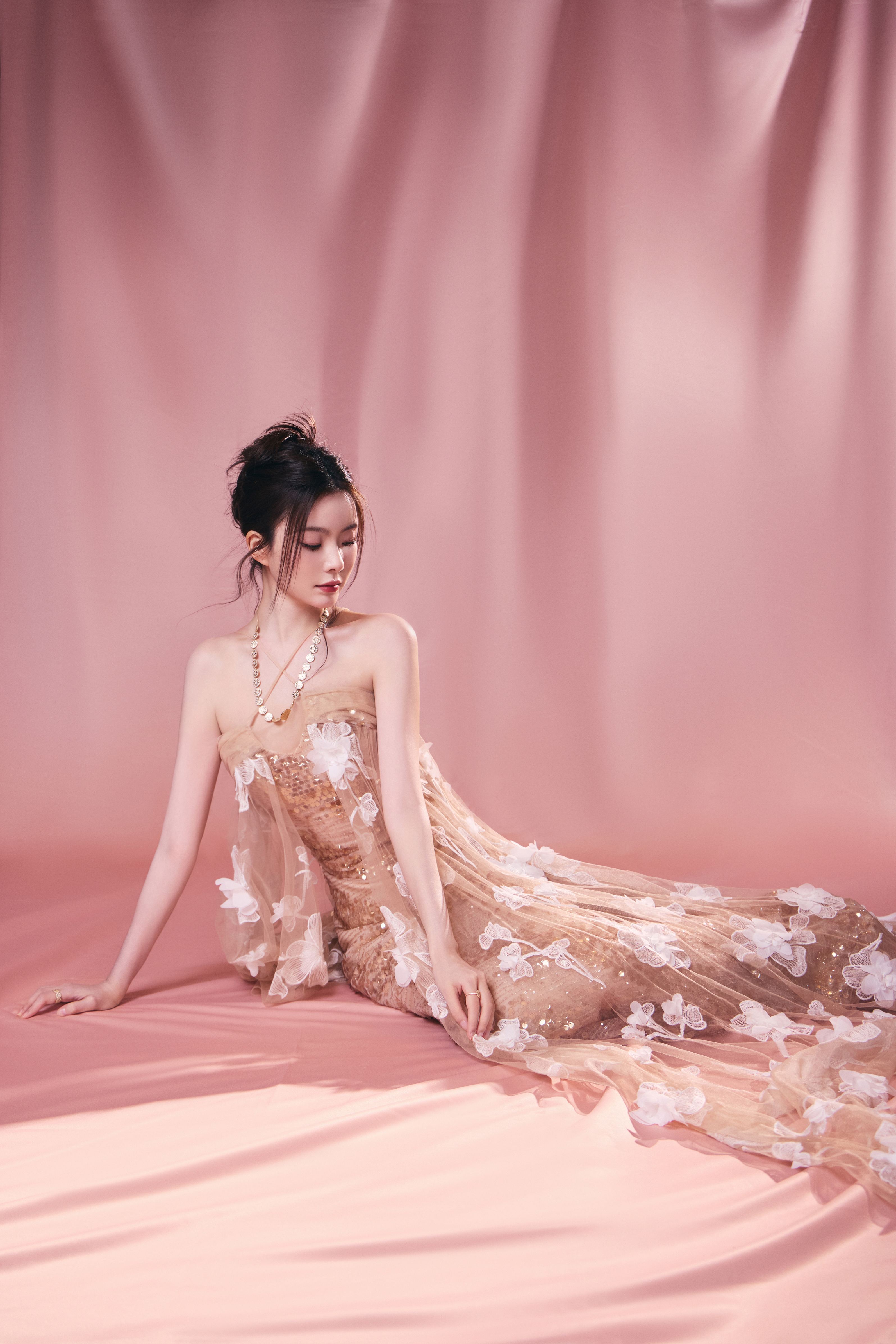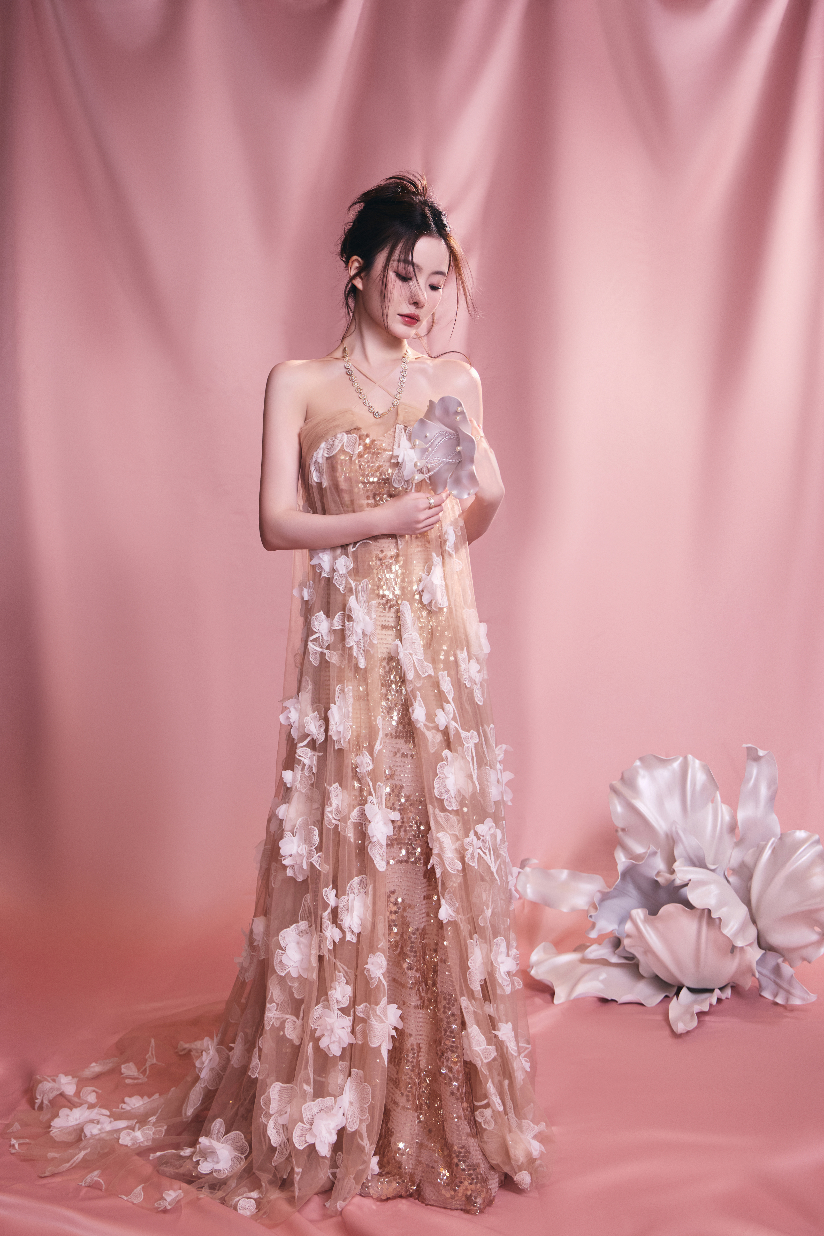 陈卓璇 裸色纱裙裹挟温柔光晕,立体花簇似梦境绽放。十一快乐