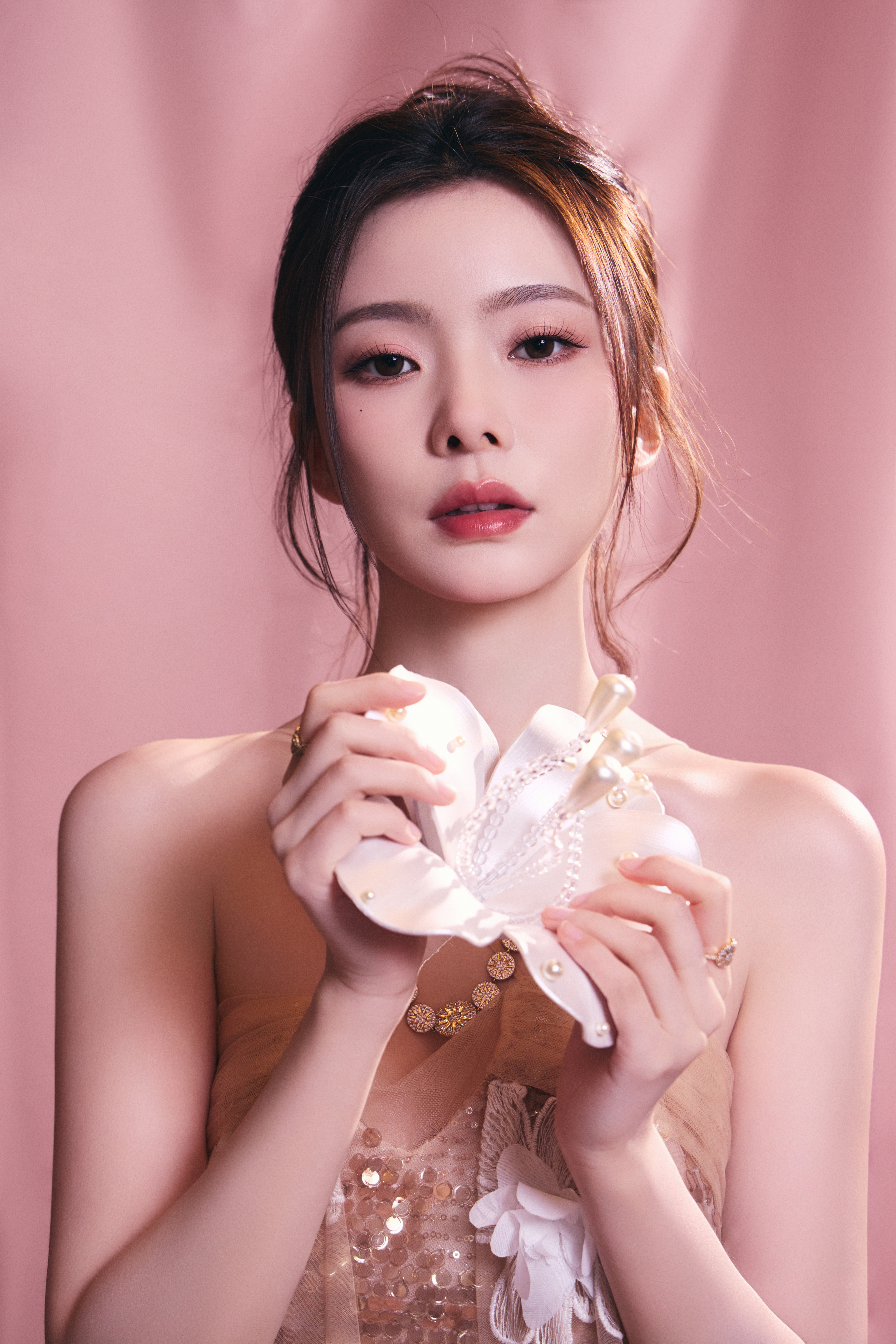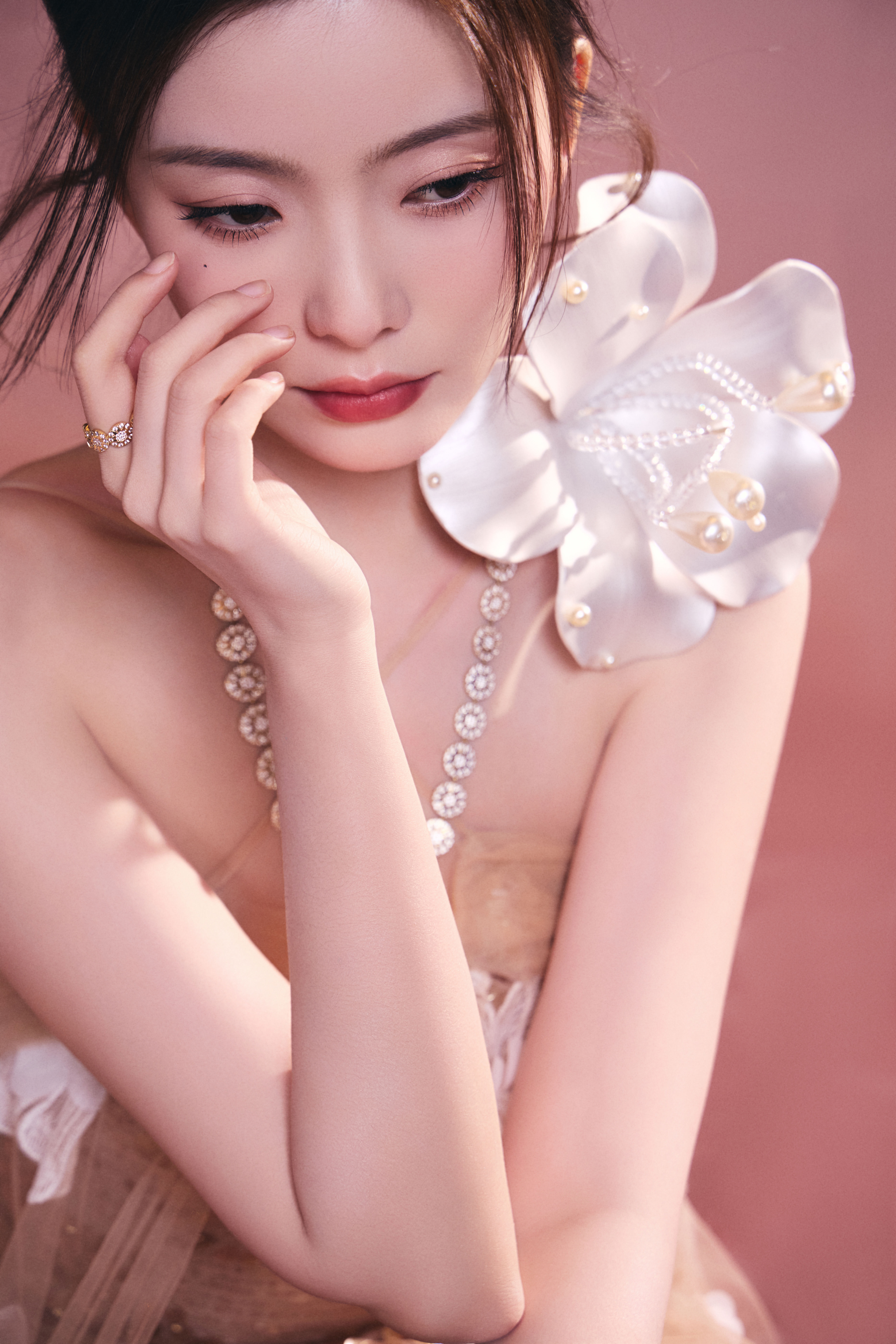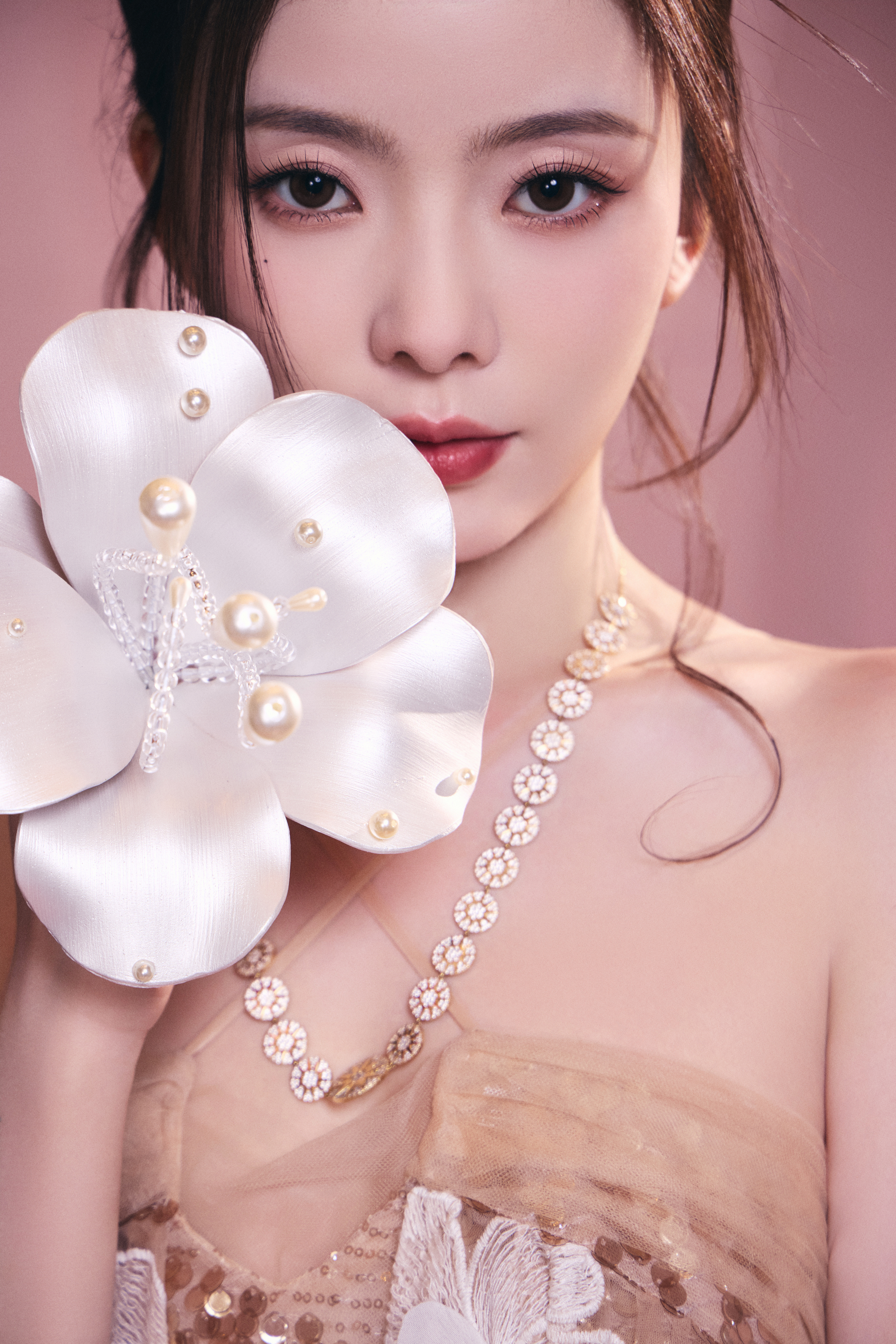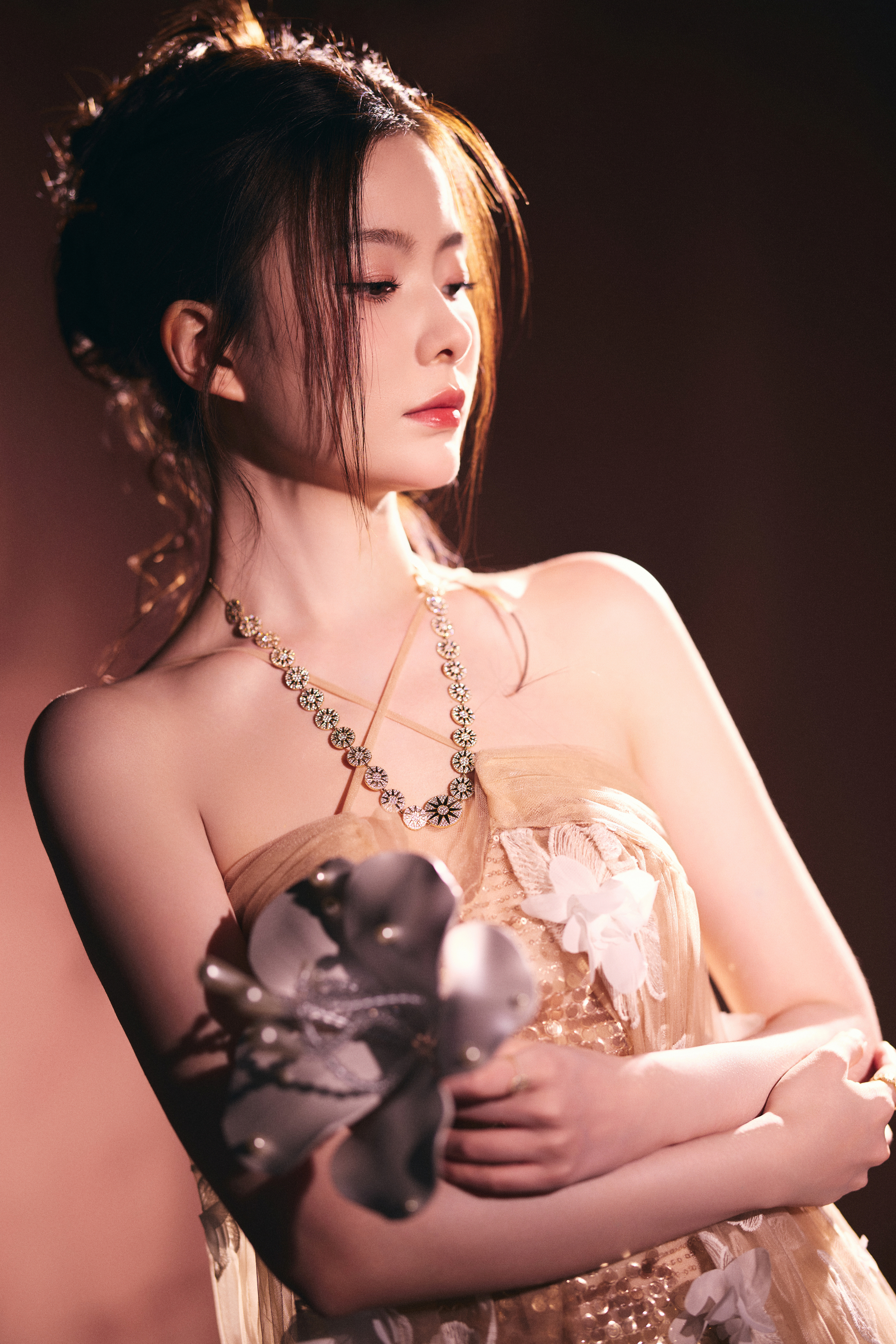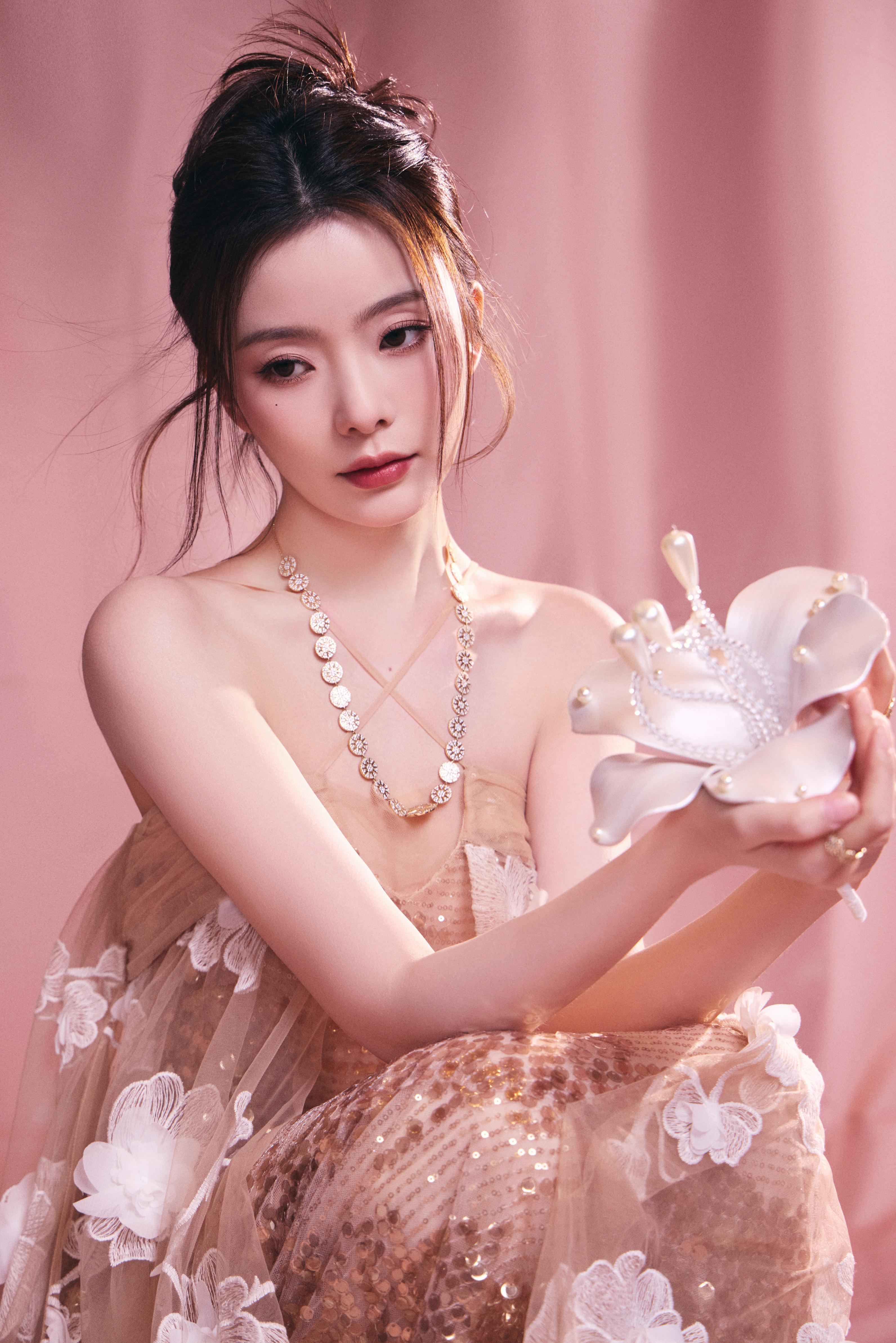 陈卓璇 裸色纱裙裹挟温柔光晕,立体花簇似梦境绽放。十一快乐