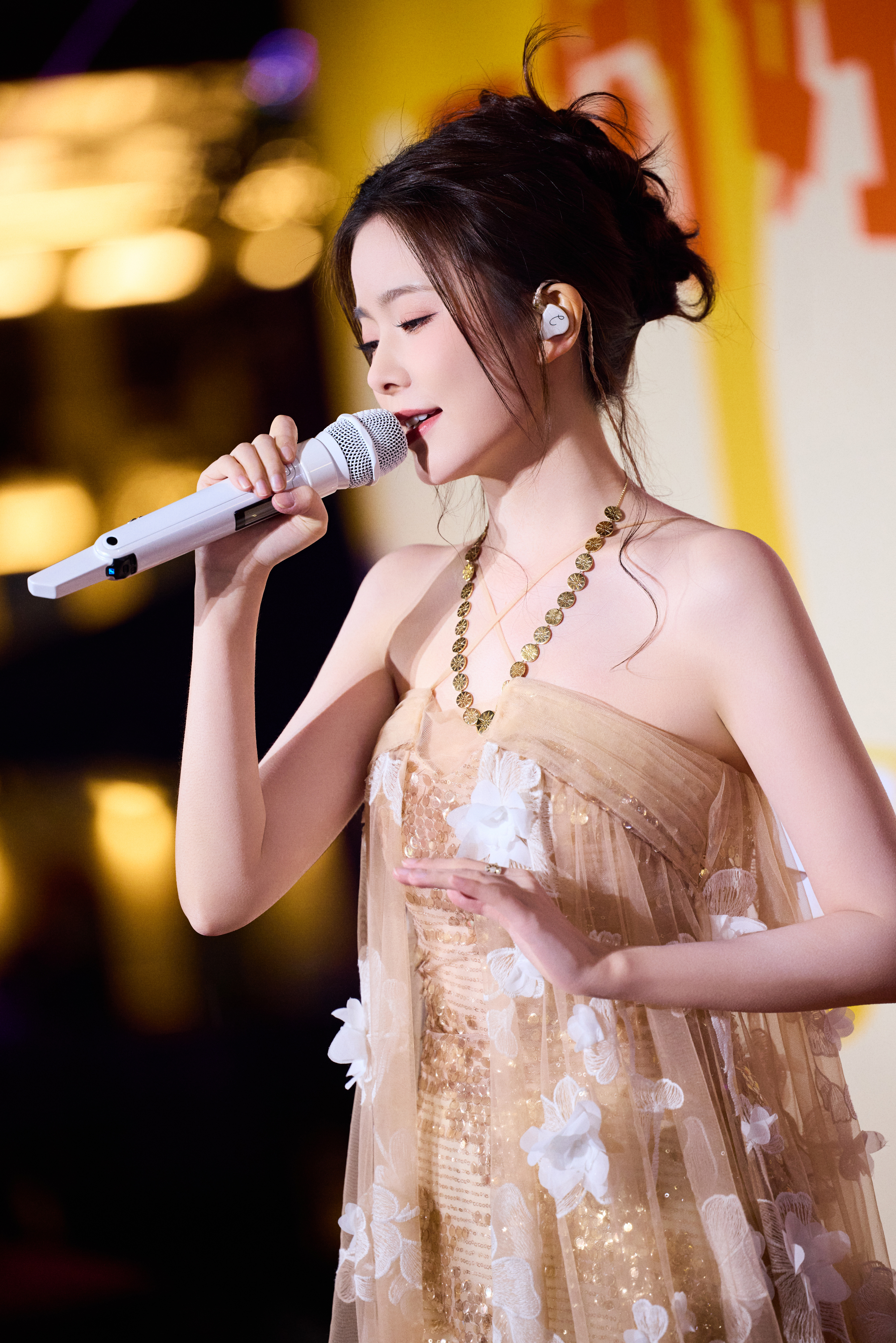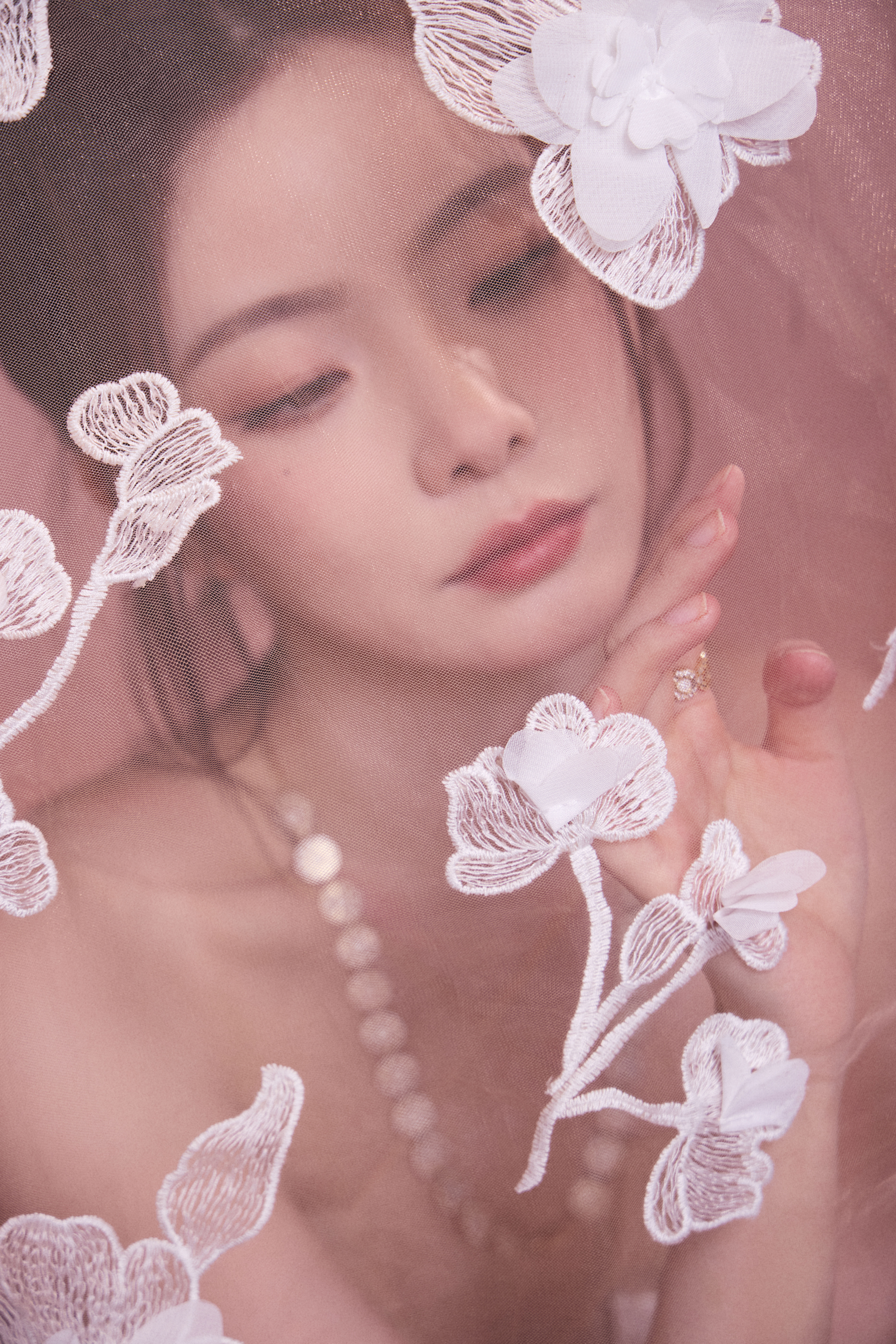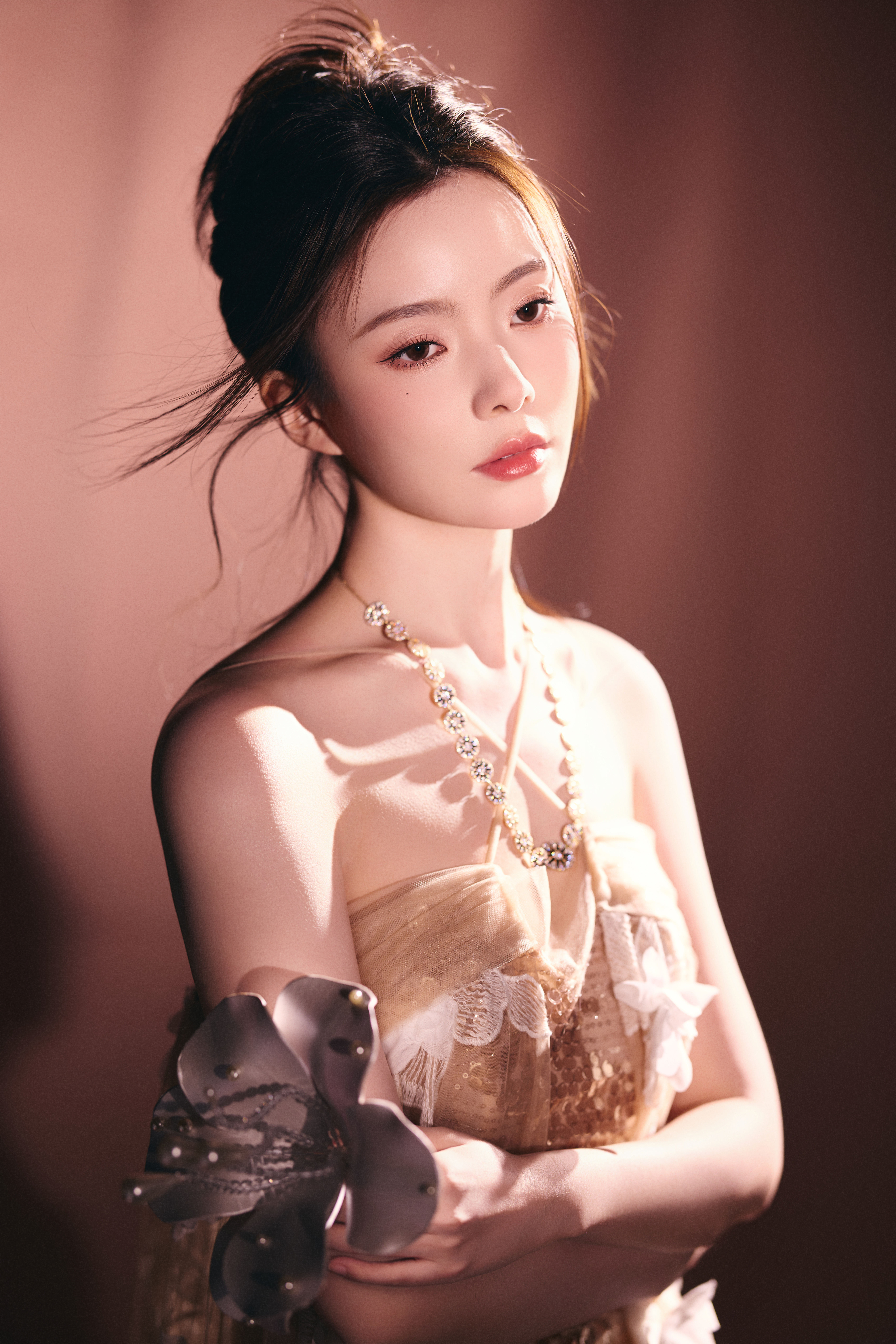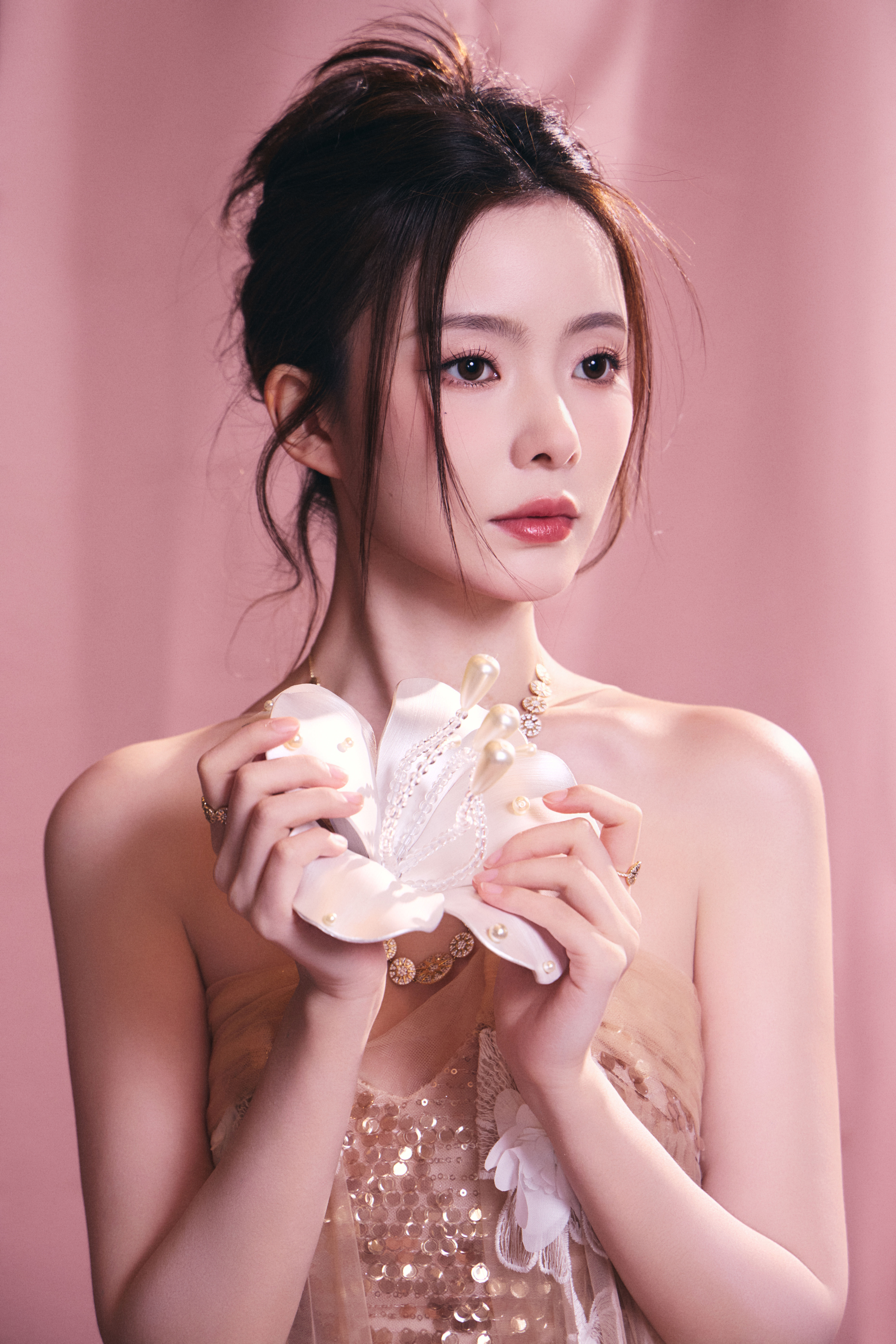 陈卓璇 裸色纱裙裹挟温柔光晕,立体花簇似梦境绽放。十一快乐