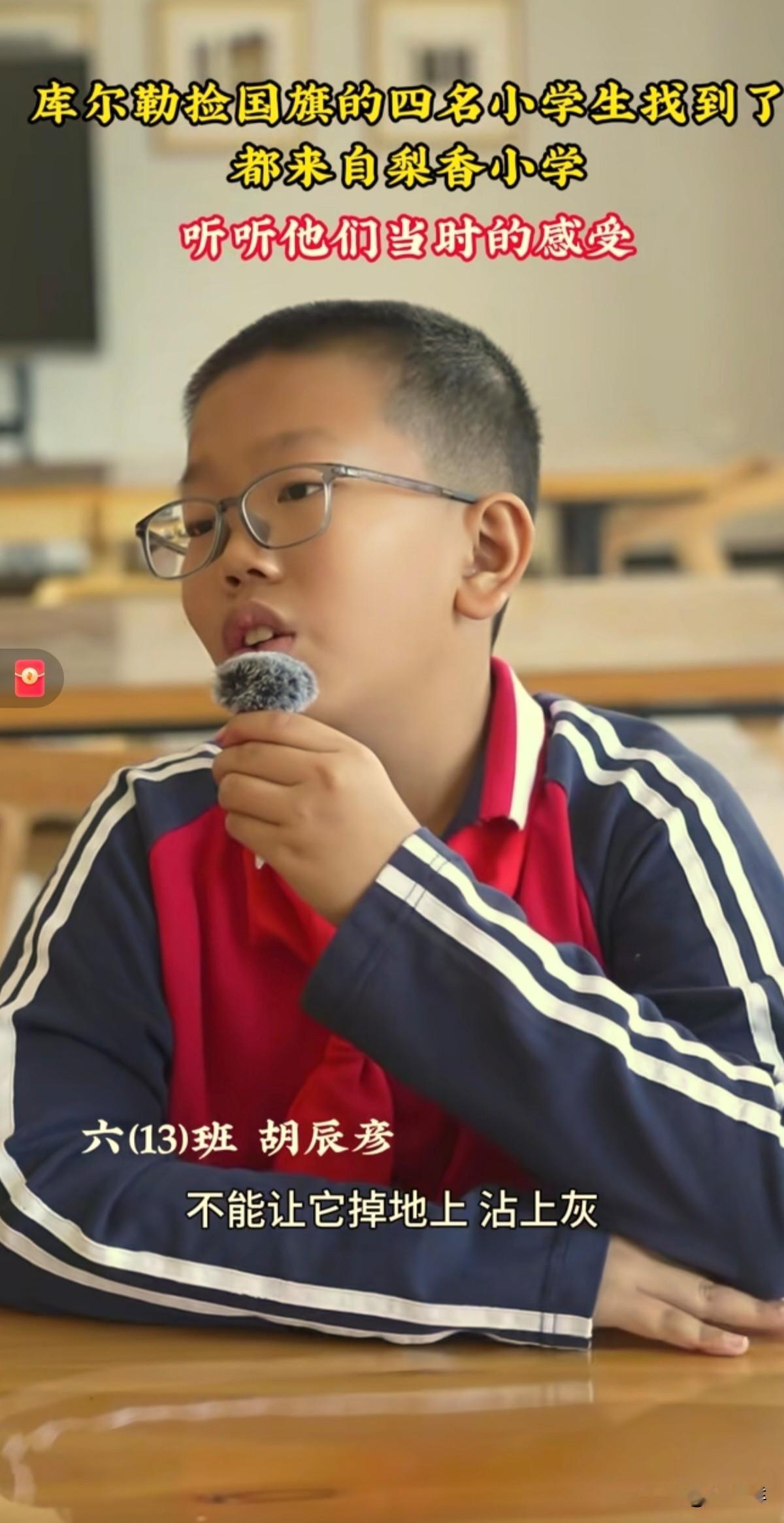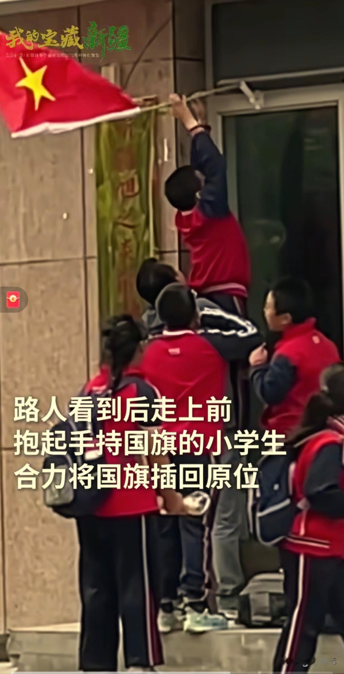 被新华社通报点名表扬了! 新疆库尔勒,四名小学生路过店铺发现悬挂的国旗🇨🇳落在地上,齐心协力把国旗挂回墙上的事情,赢得了全网网友的一直表扬和支持! 网友说:少年有信仰,祖国有希望! 四名小学生放学回家,路过店铺看见店铺悬挂的国旗掉被风吹落、落在地上,戴着眼镜的小胖同学上前捡起国旗,国旗迎风飘扬,然后商量着如何挂上去。 小胖同学说:“咱俩一起,能不能把这个国旗弄上去,就看你了,就你最轻。” 插国旗的位置太高了,四个孩子尝试了几次,跳起来也无法把国旗插回原来的位置。但是四个孩子没有放弃,于是决定相互配合采取“搭人体”的方式托举体重最轻的同学去悬挂国旗。 很可以的是,由于身高和力气不足,尝试多次都失败了,孩子们显得很着急。 一个路过的大哥看到,跑上去把拿着国旗的孩子抱起来,这次孩子成功把国旗插回原位。 一位路过的大哥见状上前抱起手拿国旗的孩子,这次成功将国旗插了上去。大哥把孩子放下,回过头看了看孩子们,然后笑着离开了。 “我无论如何也要让它迎风飘扬。” “不能让它掉地上、沾上灰,被别人踩脏或者说给弄坏了。” “挂上去的时候,自己很有成就感。” “国旗迎风飘扬的样子十分漂亮。” 四个孩子如是说到。 有网友评论:这位大哥没有选择接过国旗自己插上去,而是选择托举孩子放回,上一辈托举起下一代,下一代托举起国旗🇨🇳,一代代就这样埋下热爱祖国的基因! 还有网友评论:本来很高兴的事,不知道怎么的,流眼泪了。现在的孩子们真的比我们想象的还爱国,他们真的是新生的一代。祖国也是一代一代托举发展到今天。 孩子们的笑容稚嫩、肩膀轻,年龄小,但是掩盖不了那颗藏在身体里爱国的赤忱之心,一代一代的爱的传承,对我们祖国爱的深沉。传承不需要言语,爱祖国需要一代代传下去。先辈们不要担心,我们后继有人!