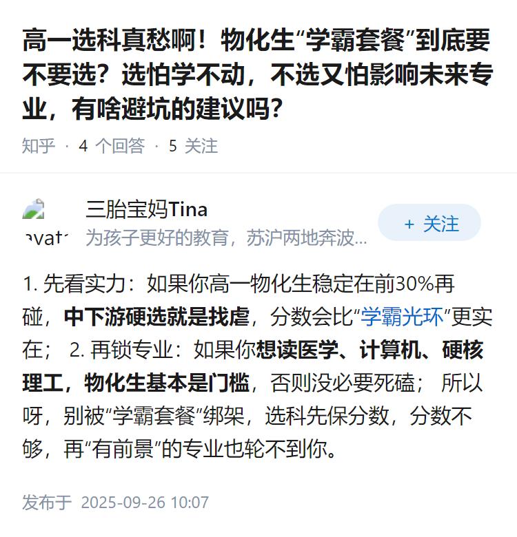 高一选科真愁啊!物化生“学霸套餐”到底要不要选?选怕学不动,不选又怕影响未来专业,有啥避坑的建议吗?