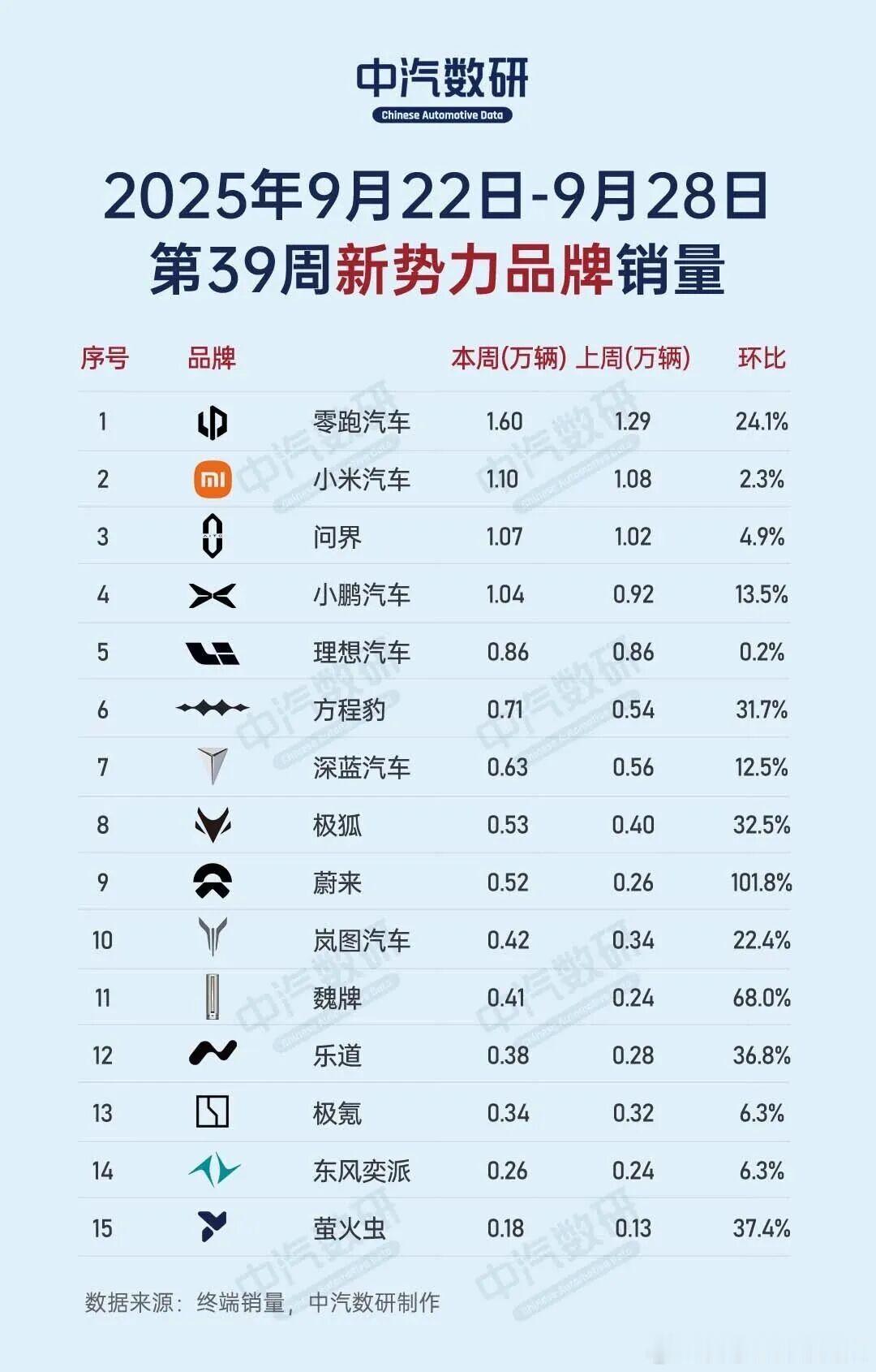 中汽数研和易车榜两家的W39数据放在一起对比更完整。其实新势力有5家过万的厂商,蔚来三个品牌加起来也过万了。方程豹增长也很快。