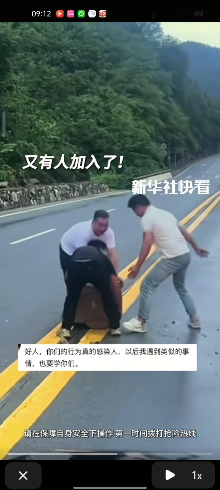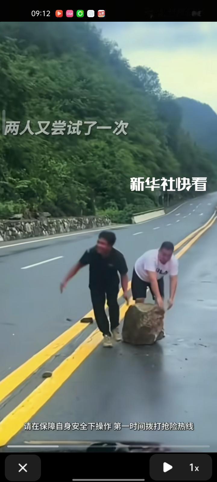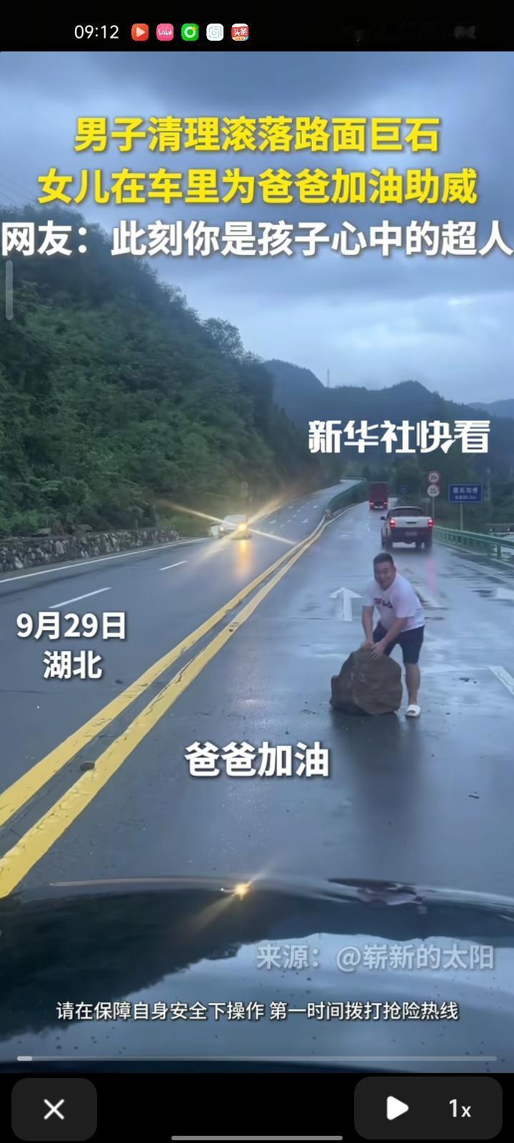 近日,十堰市房县。男子驾车途中遇到巨石挡道,若不及时排除路障,会引发交通事故。下车挪石头时,听见女儿为他加油打气,路过的司机看到后也下车帮忙,合力把巨石推到路边就离开了。