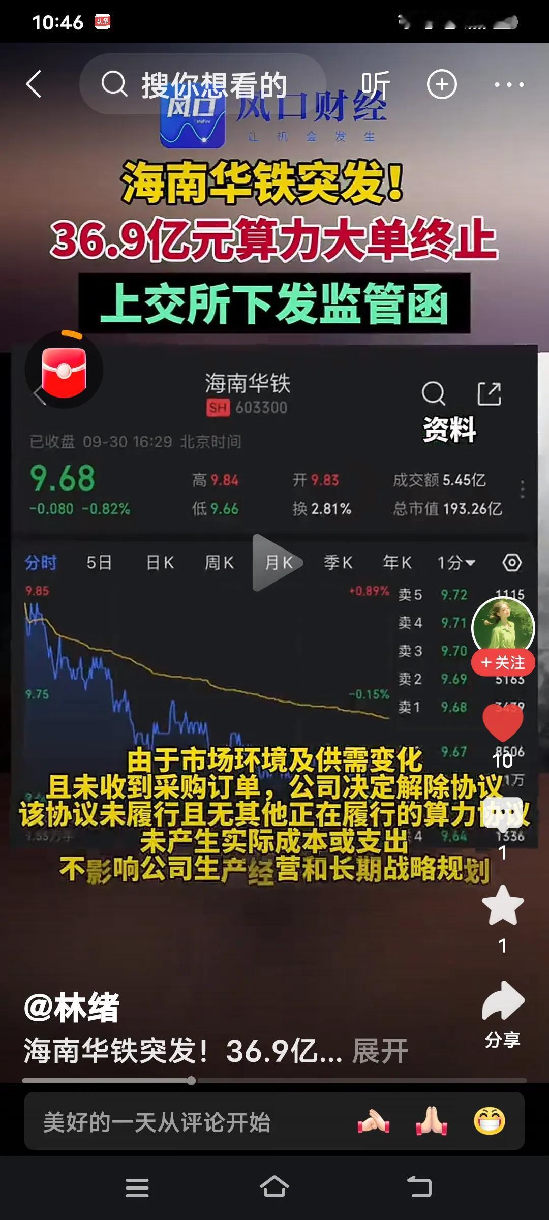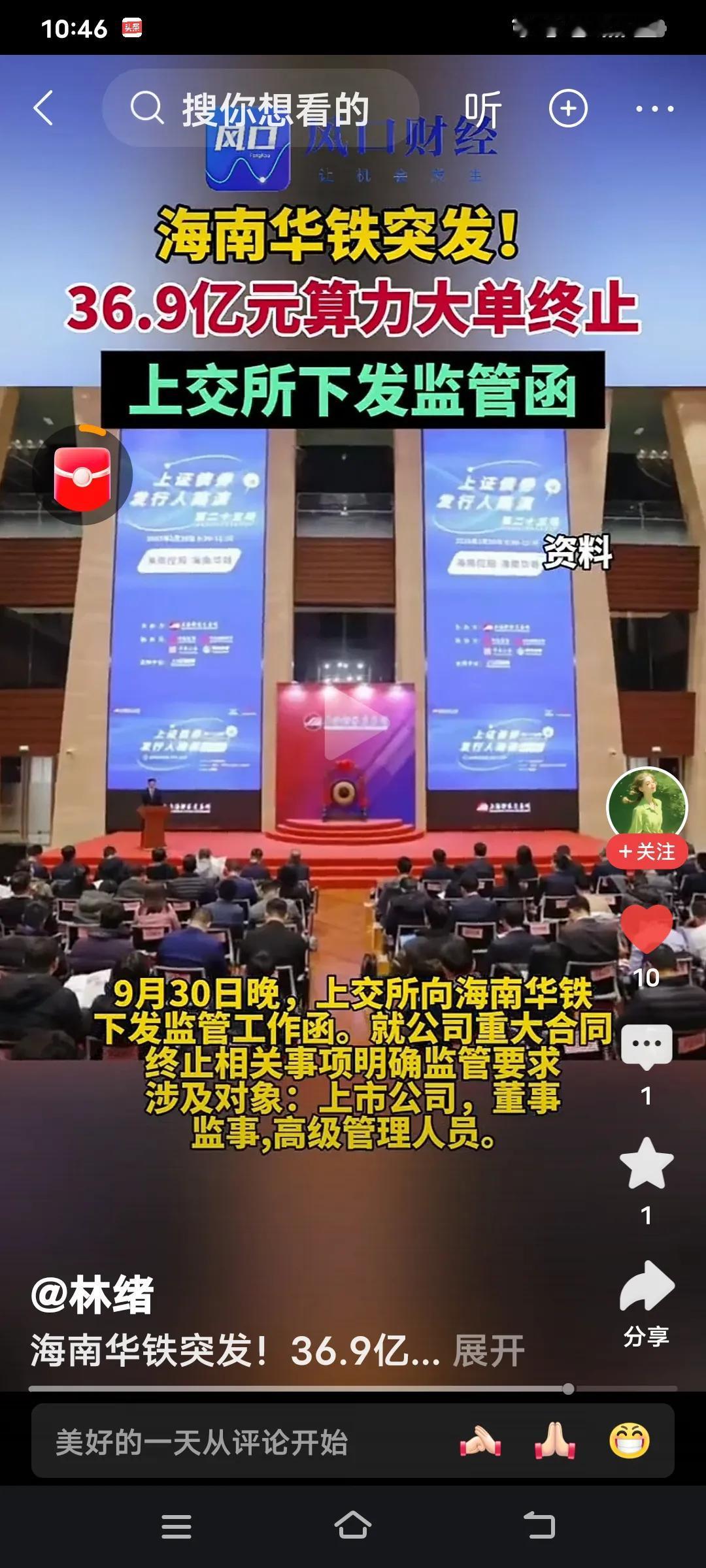 9月30日晚海南华铁突发大消息,36.9亿算力大单终止!全资子公司华铁大黄蜂和杭州X公司签的《算力服务协议》黄了。这协议原本可是约定提供5年算力服务,金额高达36.9亿。 今年3月签的约,到现在却表示市场环境和供需变了,还没收到任何采购订单,所以就解除协议。好在没产生实际采购成本等,没对公司当期经营等造成实质性影响。 同日,上交所火速下发监管函,对上市公司、董监高明确监管要求。海南华铁此前拓展算力业务想开辟第二增长曲线,这单子没了,后续发展走向还真让人捏把汗。 国产算力产业 中国算力产业 海南华铁 国产算力链 算力产业联盟