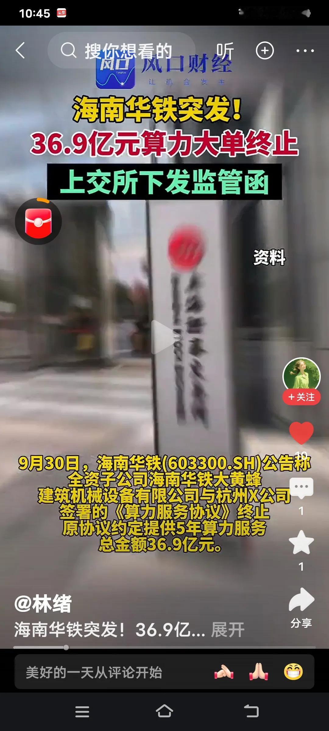 9月30日晚海南华铁突发大消息,36.9亿算力大单终止!全资子公司华铁大黄蜂和杭