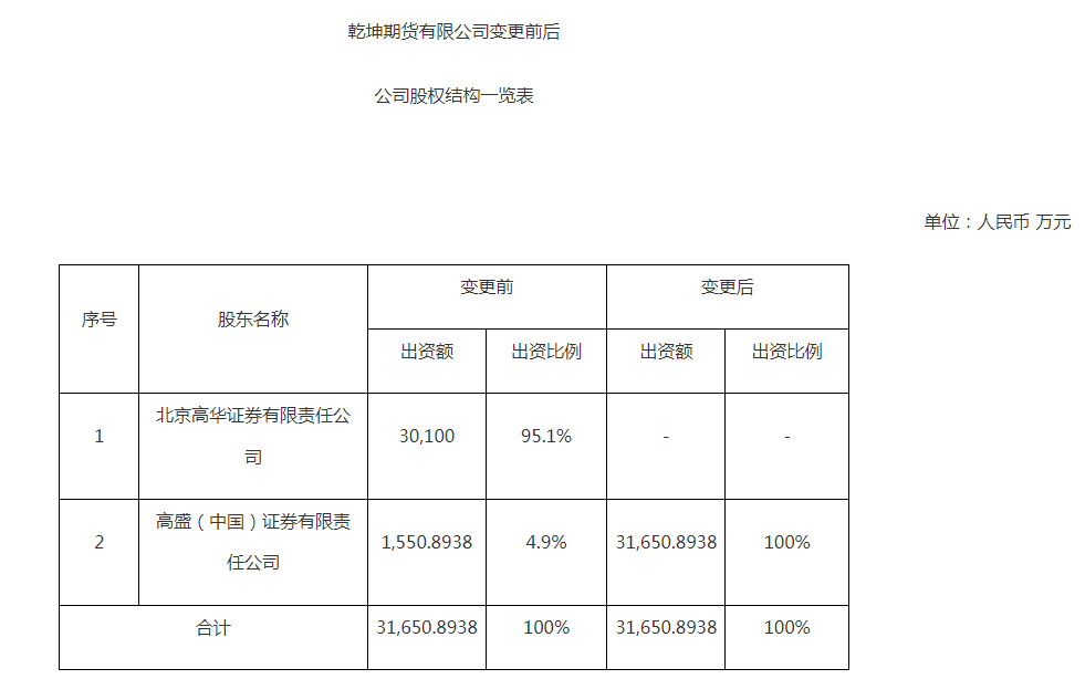 公司股权结构变更一览表显示,本次获批前,乾坤期货由北京高华证券(下称“北京高华”)持股95.1%,高盛(中国)证券(下称“高盛中国”)持股4.9%。变更后由高盛中国全资持有,出资额为3.17亿元。