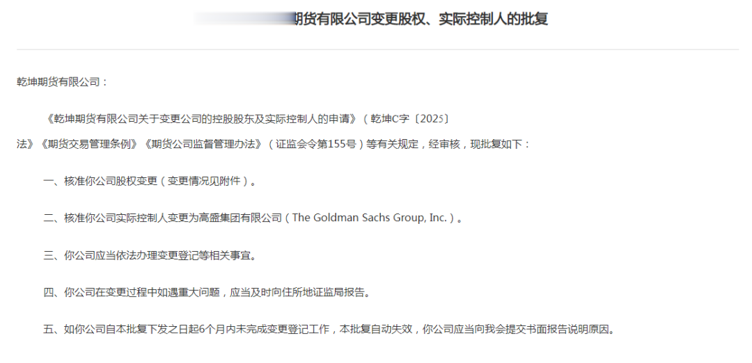日前,中国证监会官网披露显示,乾坤期货有限公司获批变更股权和实际控制人,公司实际控制人变更为高盛集团有限公司(TheGoldmanSachsGroup,Inc.)。至此,我国境内已有4家外资独资期货公司。