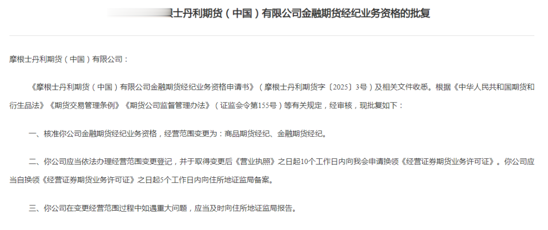 与乾坤期货股权变更获批同时披露的,还有摩根士丹利期货的金融期货经纪业务批文。中国证监会称,核准摩根士丹利期货的经营范围变更为商品期货经纪、金融期货经纪。这意味着,摩根士丹利期货的经纪业务将进一步向股指期货、国债期货等金融期货品种拓展。