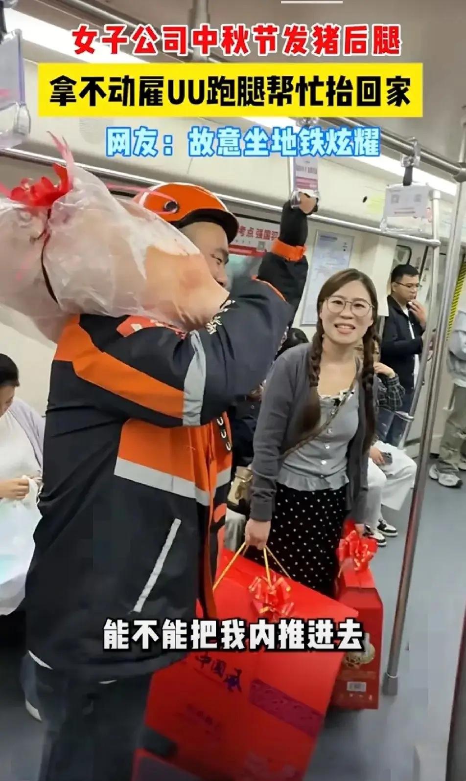 笑不活了!杭州有个姑娘,中秋前兴冲冲去公司领福利,原以为是月饼礼盒加购物卡的常规套餐,结果前台 一递东西,她直接愣在原地,居然是一整只带骨猪后腿,沉甸甸的看着得有二三十斤! 她试着单手拎了下,胳膊瞬间沉得往下坠,换双手抱也走不动道。没办法只能当场打开手机叫跑腿,花80块请小哥帮忙。 俩人跟“临时搬运组”似的,小哥把猪后腿扛在肩上,她抱着配套的月饼礼盒,挤早高峰地铁时,周围乘客都探头看,还有人偷偷拍照,估计也没见过这么硬核的福利。 其实不管怎么说,公司愿意花心思给员工准备福利就挺暖心,就是这猪后腿的操作,估计姑娘能记到明年中秋