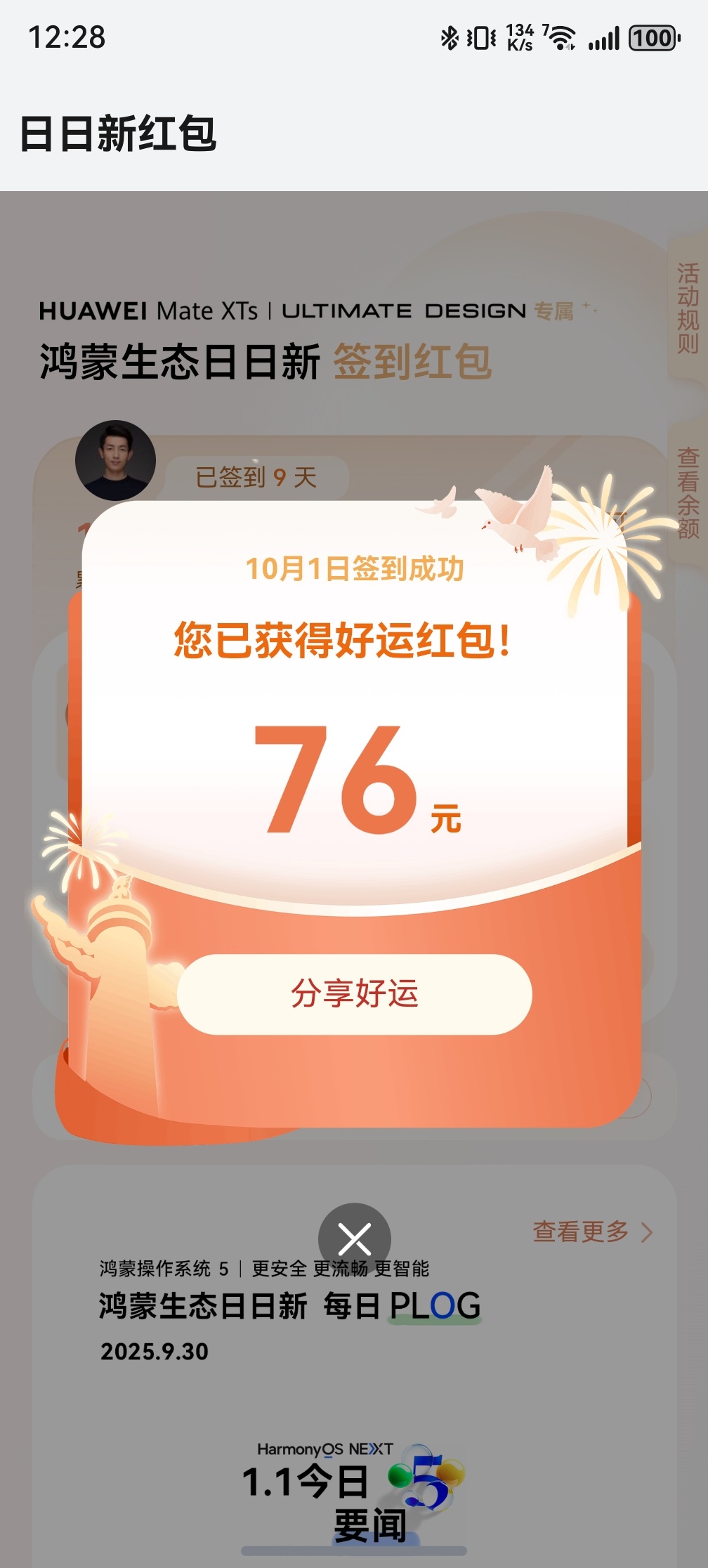 国庆假期第1天,手气不错,鸿蒙有礼红包领了76块钱。