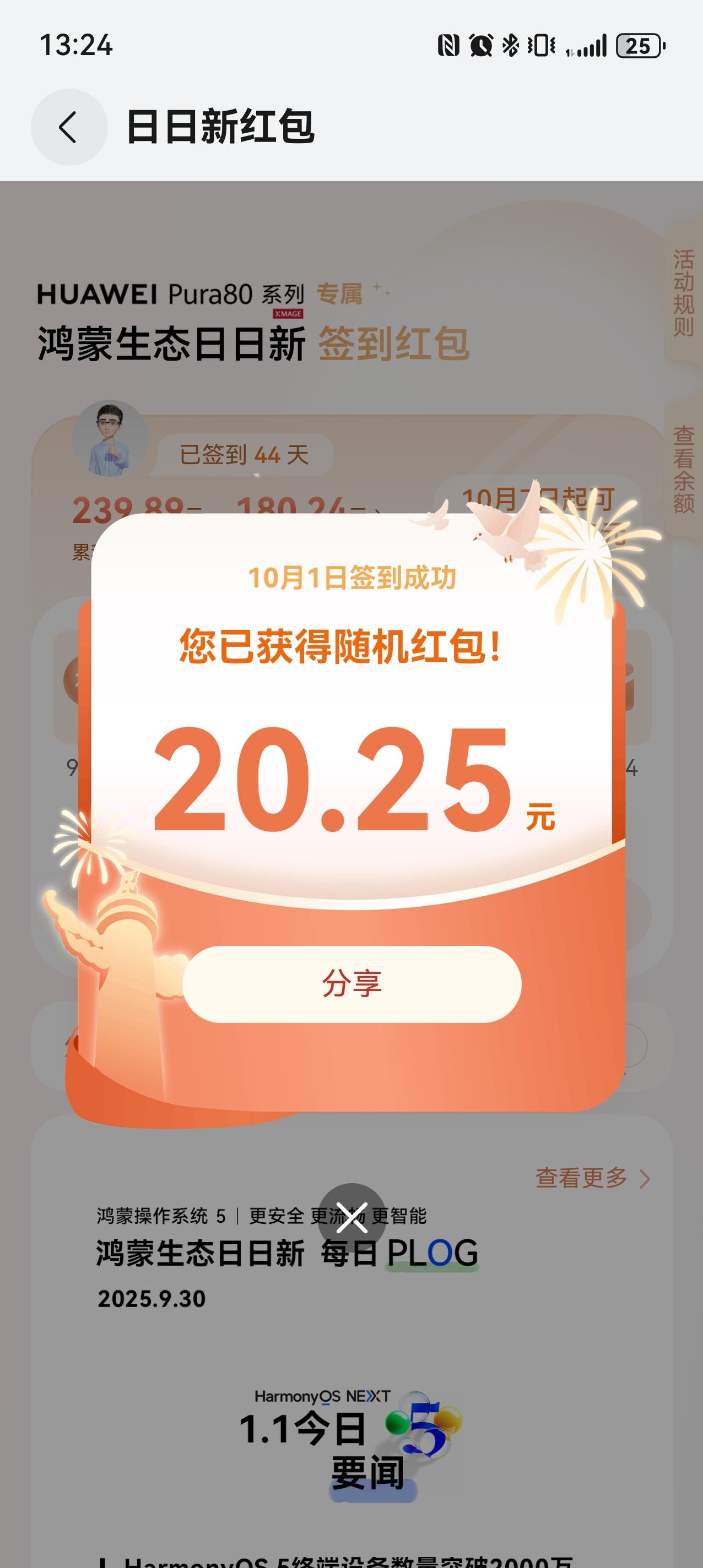 鸿蒙今天发的打卡红包是20.25,不错。 换手机以来总共已经领了两百多了,还有好多天都忘记了打卡。[大笑][大笑] 加油,鸿蒙!