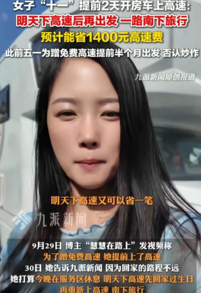 内蒙古一女子回河北老家,为了蹭十一高速免费,竟然提前2天上高速,目前已到达最后一个服务区,在这睡一晚,第二天下高速,预计能省1400元!本以为女子是心血来潮,仔细一看怎么这么眼熟,原来,之前提前半月上高速的还是她!网友:我没买车还省了好几十万呢! 河北保定某高速服务区的路灯还亮着时,房车博主慧慧已经在车旁整理行李了。 她前一晚从内蒙古提前两天上高速,特意把车停在这个离老家最近的服务区,就等 10 月 1 日零点高速免费时段一到,再下高速回家。 这趟行程她算得很清楚:内蒙古到保定的 400 元高速费能省,之后从保定南下旅行还能再省 1000 多,加起来 1400 元,够给房车添个新的车载储物箱。 很多网友不知道,这已经是慧慧第二次靠 “提前规划” 蹭高速免费了。 今年五一去新疆时,她的操作更 “拼”:3000 多公里的路程,她提前半个月就开上了高速,每天只开 3 小时,车速稳在 80 码,一天最多走 200 多公里。 沿途 60 多个服务区,成了她的临时落脚点 —— 饿了就和同行的朋友在服务区买些蔬菜肉类,用房车自带的厨具做饭。 晚上就把车停在服务区的安全区域,偶尔和其他房车车友聊聊天,倒也不觉得旅途漫长。 最后赶在五一免费时段下高速,一算账,省了 1500 多块高速费,当时还有网友跟着她的视频学 “慢旅行省钱法”。 不过,两次省钱路上,慧慧都有过 “心里没底” 的时候。 她开的是 7 座以下的改装房车,虽然行驶证标注 “小型客车”,但第一次去新疆时,她不确定这种车型能不能享免费政策。 当时她拍了条视频,拿着行驶证问网友,没想到视频火了,还有人说她 “故意炒作博流量”。 为了确认,她专门跑了高速管理站,工作人员明确说 “7 座及以下小客车都能免费,合规改装房车也包含在内”,这才放下心。 这次国庆出发前,她又去收费站咨询台确认了一遍,得到肯定答复,才装着行李和厨具上了路。 慧慧能这么笃定,其实靠的是交通运输部的明确规则。 就像这次国庆中秋假期,官方早就公布:10 月 1 日 0 时到 10 月 8 日 24 时,全国收费公路对 7 座及以下小客车免费。 最关键的是,高速免费看的是 “驶离出口时间”,不是 “驶入时间”—— 哪怕 9 月 30 号上高速,只要 10 月 1 号后下高速,就能免费用。 慧慧的事儿在网上传开后,评论区吵成了一团。 有人说 “1400 块够我一个月房租,这姐太会过日子了”。 也有人觉得 “在服务区住一晚太遭罪,又吵又没热水,不如多花点钱住酒店”。 还有人开玩笑 “我连车都没有,省了高速费还省了买车钱,这才是真省钱”。 不过,不是所有人都能像慧慧这样 “省钱成功”。 2024 年五一,山西有个大哥,为了省 600 块高速费,提前四天开旧面包车带家人出门,结果半路车胎爆了,服务区没合适的备胎,只能叫拖车。 花了 300 多拖车费不说,最后还没赶上免费时段,又交了高速费,亏得直叹气。 还有 2023 年国庆,浙江有对小夫妻,没硬熬服务区,提前一天上高速,中途在县城找了家 60 块的民宿,第二天再走。 既避开拥堵,又省了一半高速费,还吃了当地的小笼包,比在服务区啃泡面舒服多了。 说到服务区,国庆期间的服务区简直成了 “小集市”。 有老司机提醒,去服务区别占 “房车专用车位”,那是给需要充电的房车留的。 想喝热水最好自带保温杯,开水间经常排队,有时候还没水。 带宠物的话,别让宠物乱跑,不少服务区有专门的宠物活动区。 还有人拍了视频,服务区停车场停满了车,连过道都堵了,有人为了抢充电位吵起来,最后还是工作人员调解才平息。 要是在高速上遇到事故,也别慌。 应急管理部有 “三步处理法”:先把车挪到应急车道,开双闪,在车后 150 米放三角警示牌。 再用手机拍事故现场照片,包括两车位置、车牌和受损情况。 最后打 12122 报警。 手机上的 “高速应急服务” 小程序也好用,能直接联系救援,还能查附近的加油站和服务区,出门前可以存好。 现在,慧慧已经收拾好东西,等着零点下高速。 她说明天回家,正好能赶上妈妈做的生日饺子。 其实不管是像慧慧这样 “用时间换省钱”,还是其他人 “多花钱图轻松”,大家国庆出门,图的都是顺心。 毕竟假期就那么几天,能按自己喜欢的方式走,比什么都重要。 如果各位看官老爷们已经选择阅读了此文,麻烦您点一下关注,既方便您进行讨论和分享,又能给带来不一样的参与感,感谢各位看官老爷们的支持!