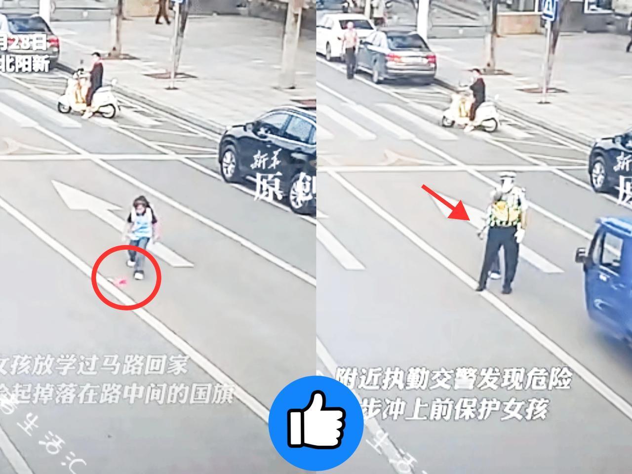 刚刷到这个视频 , 真的被湖北这个小姑娘感动了!放学路上看见路中间掉了面国旗,她连犹豫都没犹豫,直接就往车流里跑,那小身影看得人手心全是汗! 还好交警蜀黍反应快,跟箭一样冲过去,张开胳膊就挡在车子前面,一边护着她把国旗捡起来,一边慢慢领着她过了马路。 后来有人问她不怕吗,小姑娘说得特认真:“国旗哪能掉地上啊,看见就得捡起来。” 别总说爱国离我们远,这事儿不就是最好的证明?爱国从不是什么轰轰烈烈的大事,是小娃娃心里“国旗不能脏”的执念,是交警蜀黍“得护住孩子”的本能。 这就是中国人刻在骨子里的爱国,小女孩好样的,给你点赞国旗下的感动