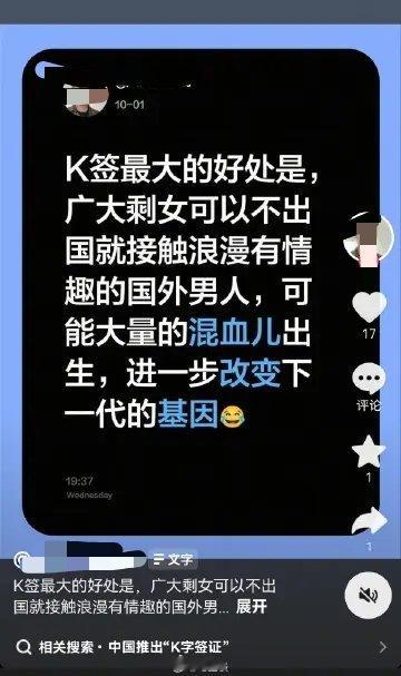 “K签有利于中国女子找国外男人生大量混血儿,改变下一代基因”?有些国人啊是从骨子里认为自身低人一等,崇洋媚外几乎刻进了基因里![流汗]