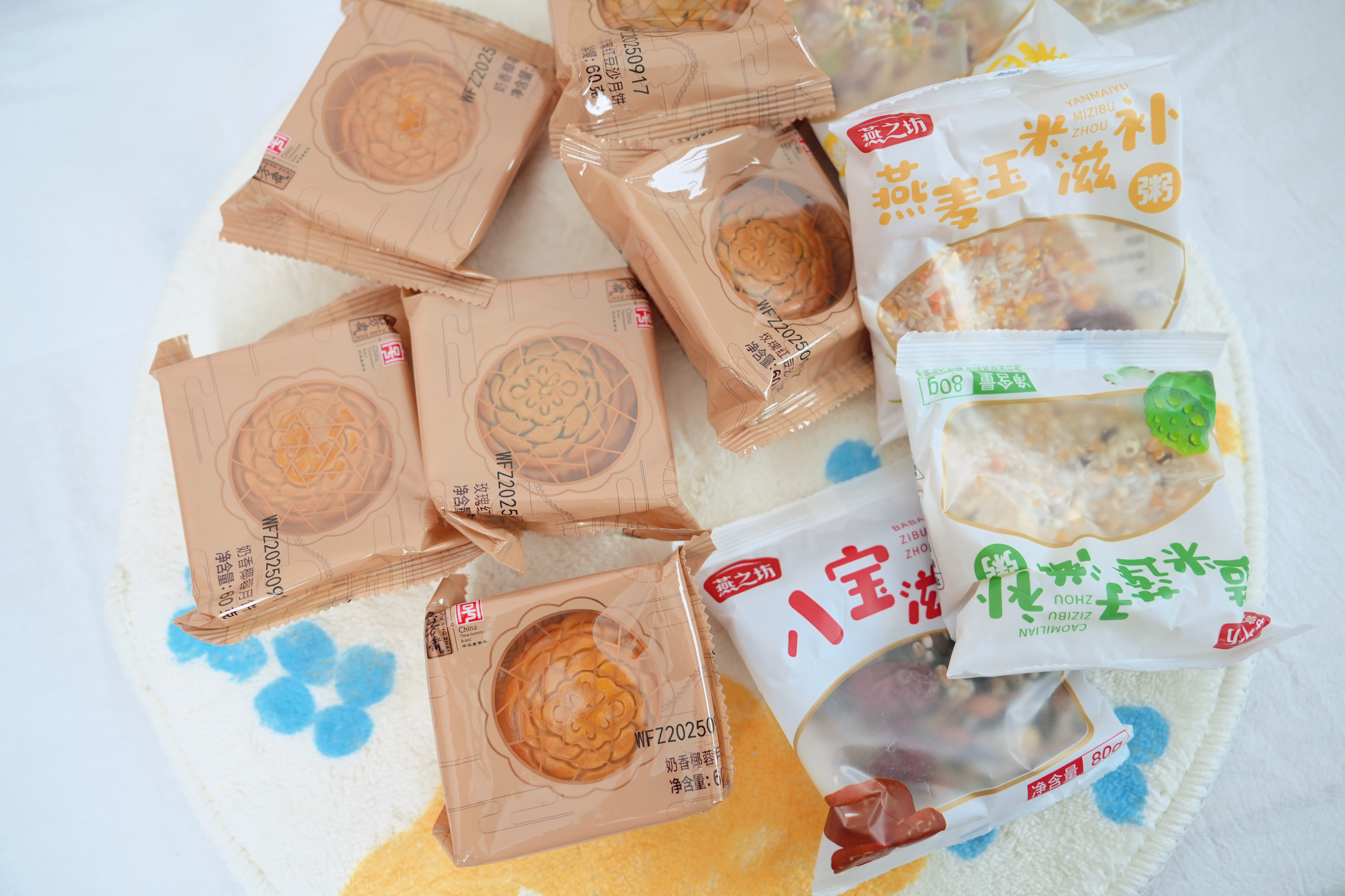感谢鲁大师送来的中秋礼盒,一个编织收纳筐,里面有月饼和养生粥,明天早饭有了[打c