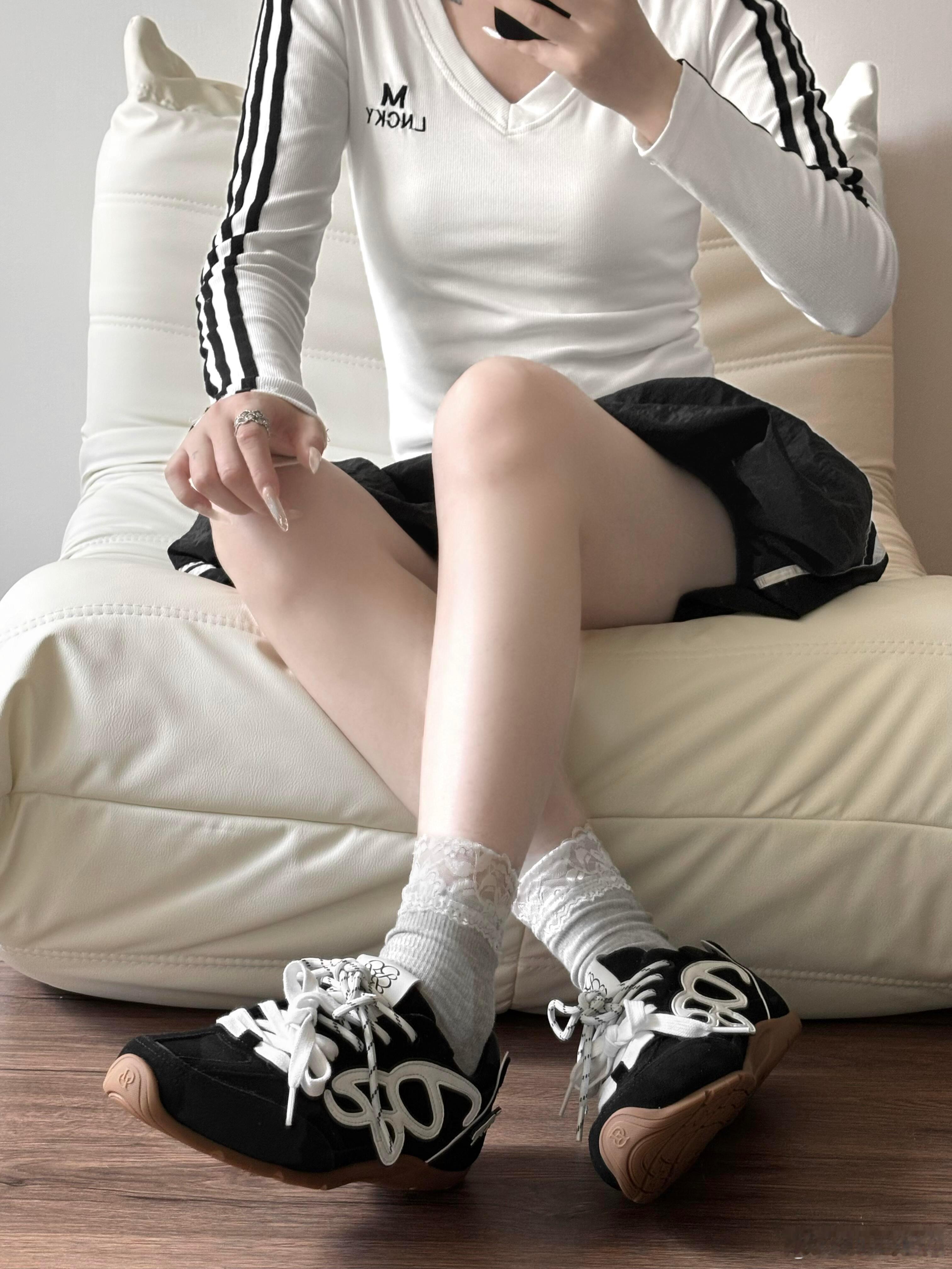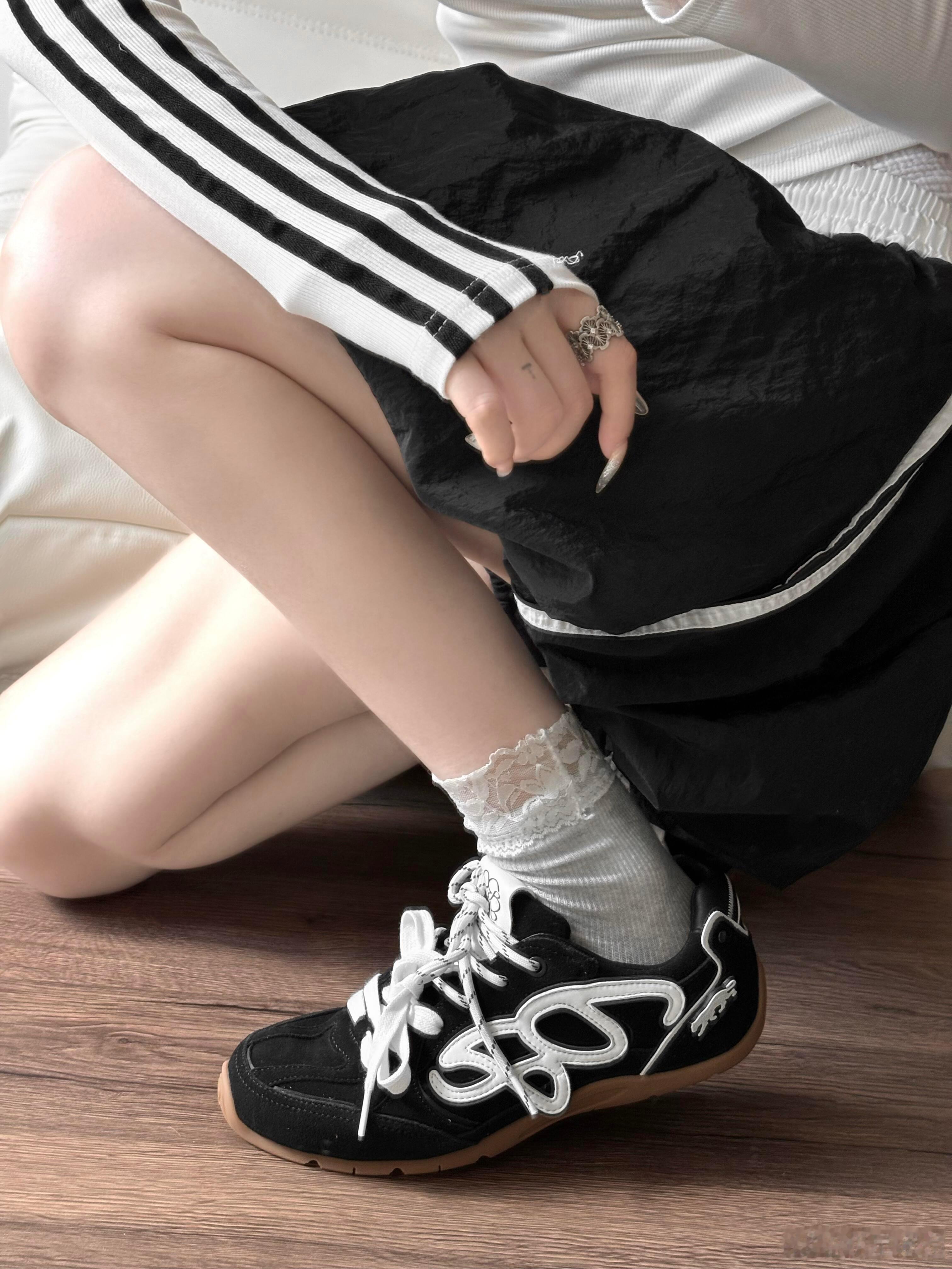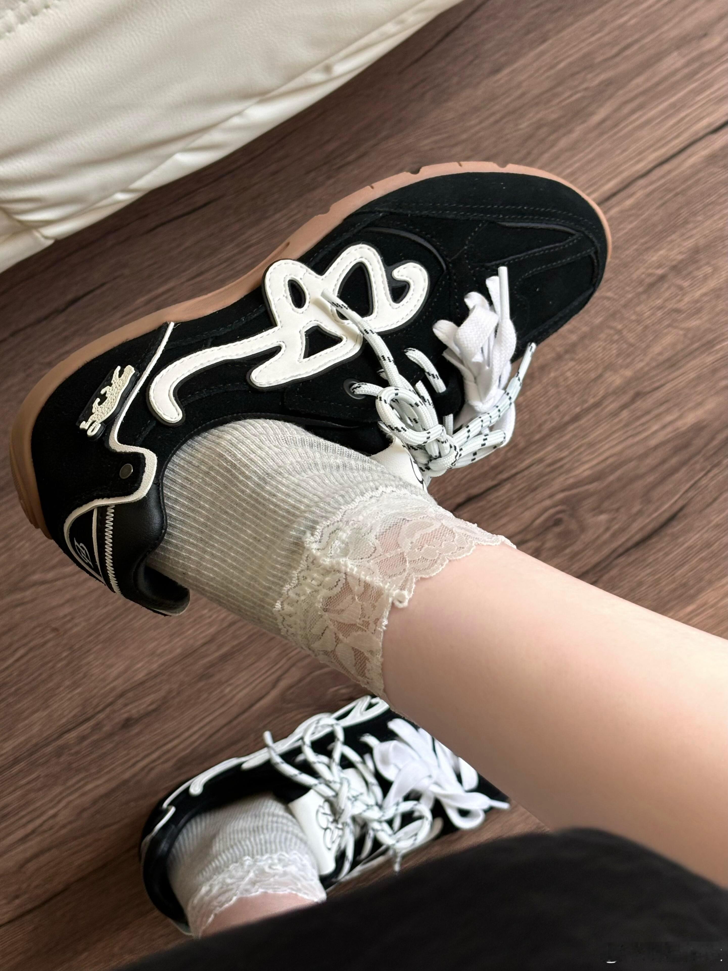 纯白鞋带带有黑色波点条纹,与黑色鞋身构成经典碰撞,而穿着者搭配的蕾丝花边白袜则为整体注入一丝复古甜美,巧妙平衡了街头感。这双鞋完美融合了低调质感与高调设计,是打造个性街头风格的出众之选。鞋控的日常时尚鞋履