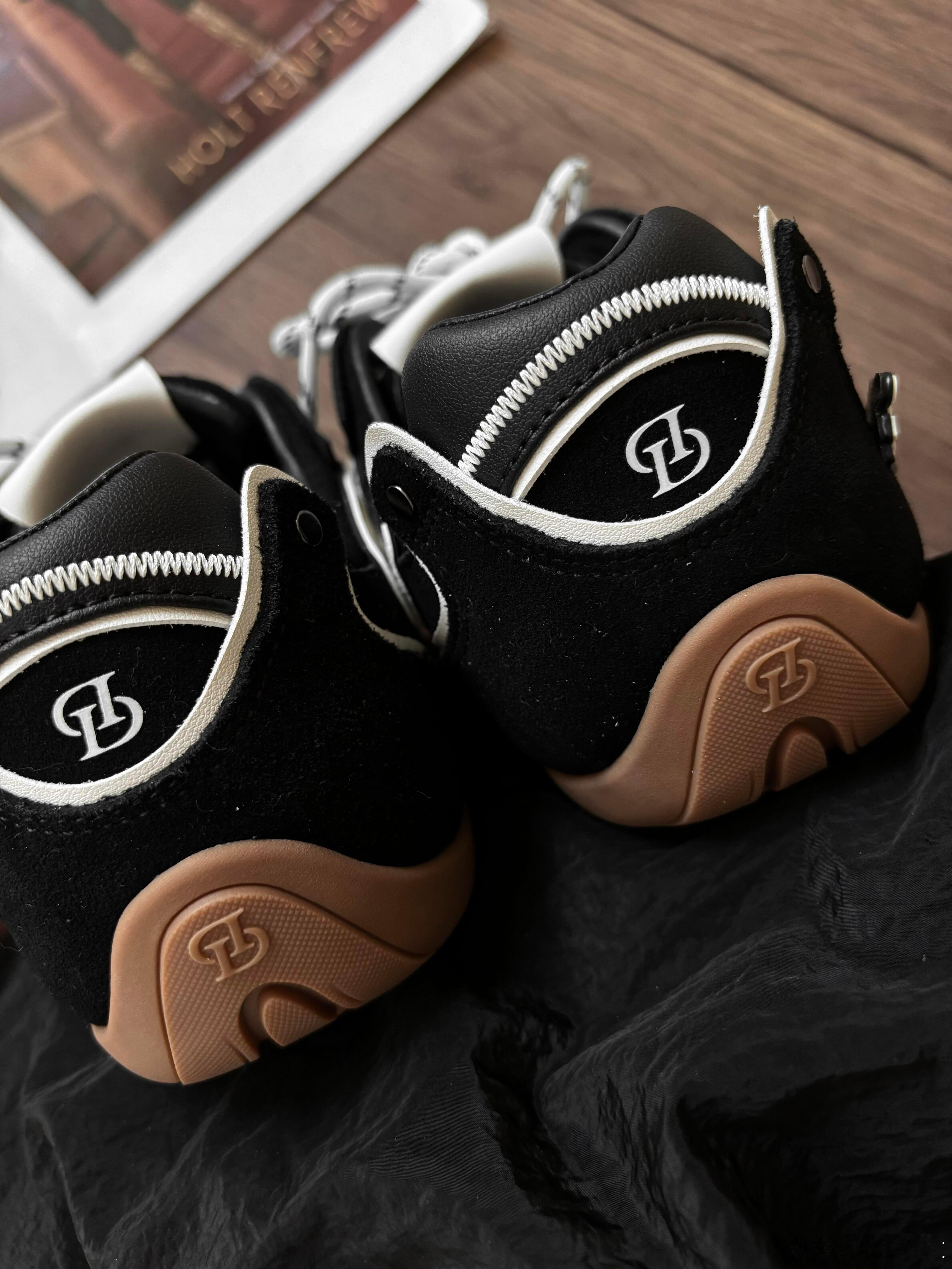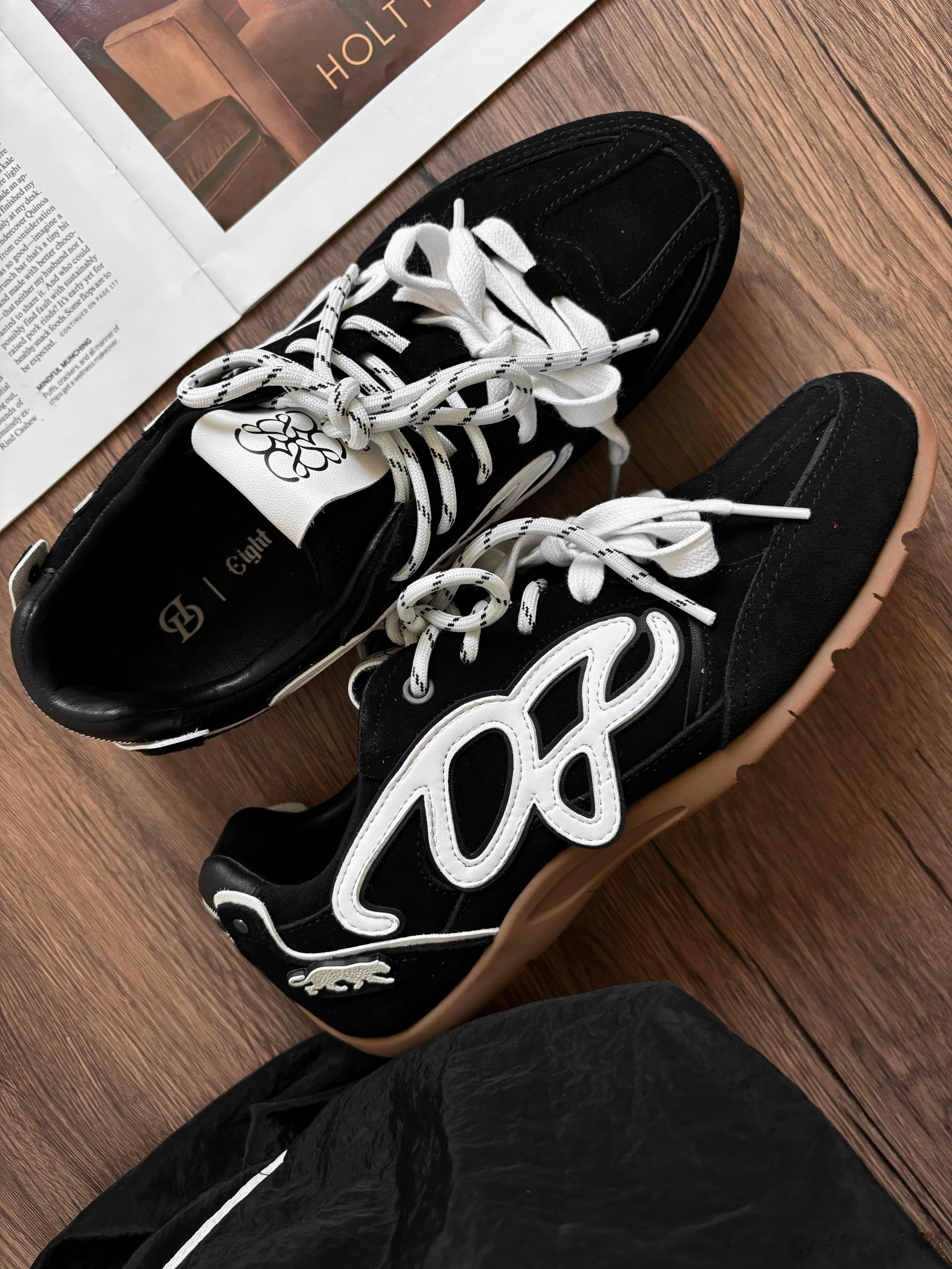 这双运动鞋以黑色绒面革打造高级基底,鞋侧醒目的白色抽象涂鸦线条极具视觉张力,成为其前卫灵魂的标识。后跟处巧妙融入米白色皮革拼接与精致动物刺绣,于细节中彰显趣味与格调。鞋身多处出现的“格调”、“KOTTON”等品牌字样,呼应了其时尚定位。