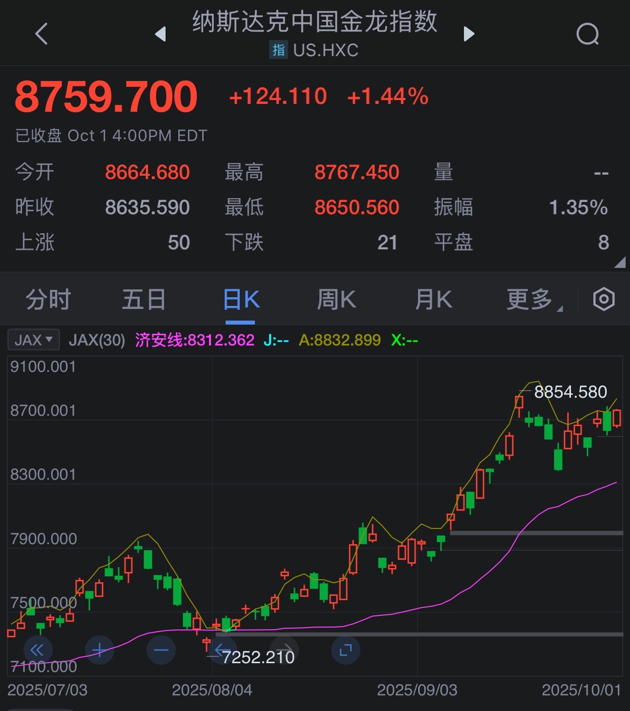 周三热门中概股多数上涨,纳斯达克中国金龙指数涨1.44%。唯品会涨超5%,百度涨超4%,京东涨超3%,阿里巴巴涨超2%,小鹏、哔哩哔哩、金山云涨超1%。