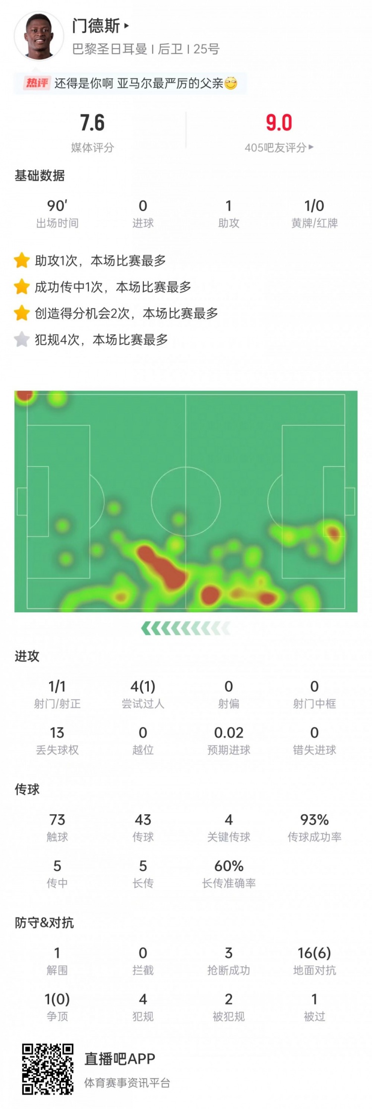 此役努诺-门德斯踢满全场送出助攻,帮助巴黎取胜,他当选本场比赛最佳球员。