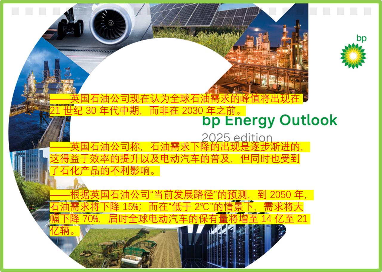 英国石油公司预计石油需求峰值将出现在 2030 年代中期。 一年前,英国石油公司曾预测石油需求的增长可能会在 2030 年之前达到峰值。在这一点上,该公司与国际能源署以及其他众多预测机构的看法一致。而今年,英国石油公司改变了其预测。如今,这家大型石油公司预计需求增长将持续到 2030 年代中期,之后将开始缓慢下降。 在最新版的《能源展望》报告中,英国石油公司指出:“在此次展望期内,石油需求将有所下降,但至少在未来 10 至 15 年内,石油仍将在全球能源体系中发挥重要作用。”据预测者称,需求下降的原因将是能源效率的进一步提高以及电动汽车销量的增长。然而,这些效率提升和电气化的趋势将被石化行业石油需求的增长所抵消。 然而,存在一个问题。英国石油公司表示,近年来能源效率的提升速度一直在放缓,这将影响未来石油需求的增长趋势。效率提升速度的放缓始于五年前,如果这种趋势持续下去,英国石油公司预计未来十年每年的效率提升幅度将为 2%,这将导致每日额外的石油需求增加约 600 万桶。 鉴于每项技术在效率提升方面都存在一定的局限性,因此要扭转过去五年中效率提升速度放缓的局面,可能会相当困难。这些进步主要体现在电力生产方面,以及风能和太阳能有可能取代天然气和煤炭成为主导的电力来源上,但它们也涉及车辆燃料效率方面的问题,而在这方面,石油占据着主导地位。 这一结果并不令人意外。英国石油公司在其报告中指出,石油和天然气需求的增长仍将由新兴经济体推动。多年来,中国一直占全球石油需求增长的一半,但如今,其需求增长率正在放缓,而其他亚洲经济体正逐渐成为主要的推动因素。印度就是最明显的例子,也是规模最大的例子,但据英国石油公司称,到 2050 年,亚洲其他地区也将对需求曲线的形成产生影响。 该公司在预测中考虑了两种情景。其中一种被称为““当前发展路径”,主要指的是现有的趋势和政策。另一种情况称为“低于 2 摄氏度”,指的是政治和企业界都将采取更积极的减排措施。在““当前发展路径”这一情景下,到 2050 年,石油需求将从 2023 年的水平下降 15%。而在“低于 2 摄氏度”这一情景下,石油需求将下降多达 70%。 在“当前发展路径”情景下,据英国石油公司称,全球大部分地区的原油需求将在 2035 年左右达到峰值,并在 2050 年之前保持平稳。而在中国和发达国家,这一需求下降趋势则较为明显。而在“低于 2 摄氏度”情景下,需求下降的速度更快,且幅度更大。在“当前发展路径”情景下,预计 2050 年的石油日需求量约为 8500 万桶,而在“低于 2 摄氏度”情景下,这一数字将降至不足 3500 万桶。 在两种情景下,石油需求预计都将得到支撑,原因在于随着全球经济活动的扩大以及发展中经济体不断提高其民众的生活水平,航空旅行量将会增加。而另一方面,从现在到 2050 年期间,原油的工业用途预计将会减少。 此外,由于旨在减少内燃机汽车销售的政策推动,交通运输领域的石油需求也将增加。英国石油公司预计,全球电动汽车和卡车的数量将从 2023 年的 4000 万辆增加到 2035 年的 4.8 亿辆——这是基于当前的发展趋势所做出的预测。而在“低于 2 摄氏度”的情景下,到 2035 年电动汽车的数量将达到 5.6 亿辆。到 2050 年,在“当前发展路径”情景下,电动汽车的数量将达到 14 亿辆,在“低于 2 摄氏度”情景下将达到 21 亿辆。作为参考,截至 2024 年,全球汽车总数估计约为 14.75 亿辆。 为了弥补运输行业需求的下降,石油需求在石化行业却在不断增加。这或许是英国石油公司预测中最不令人意外的部分。多年来,多位预测者都曾表示,石化行业将成为全球石油需求的主要驱动力,取代汽车和卡车。事实上,正如英国石油公司在其展望报告中所指出的,作为石化原料的石油需求从 2000 年的 800 万桶/日增长到 2023 年的超过 1400 万桶/日。这占了这一时期总体石油需求增长的四分之一。 然而,据英国石油公司称,由于全球经济增速放缓,未来十年石化产品的需求增长也将开始放缓。而塑料制品是石油的主要应用领域,因此这一趋势将直接影响到塑料制品的需求。 这两种情景对石油行业来说都不是好兆头,而英国石油公司本身就是该行业的大型企业之一。不过,正如该公司在其展望报告中一开始就指出的那样:“今年能源展望中所采用的这两种情景,其完全按照所描述的方式发生的可能性微乎其微。”