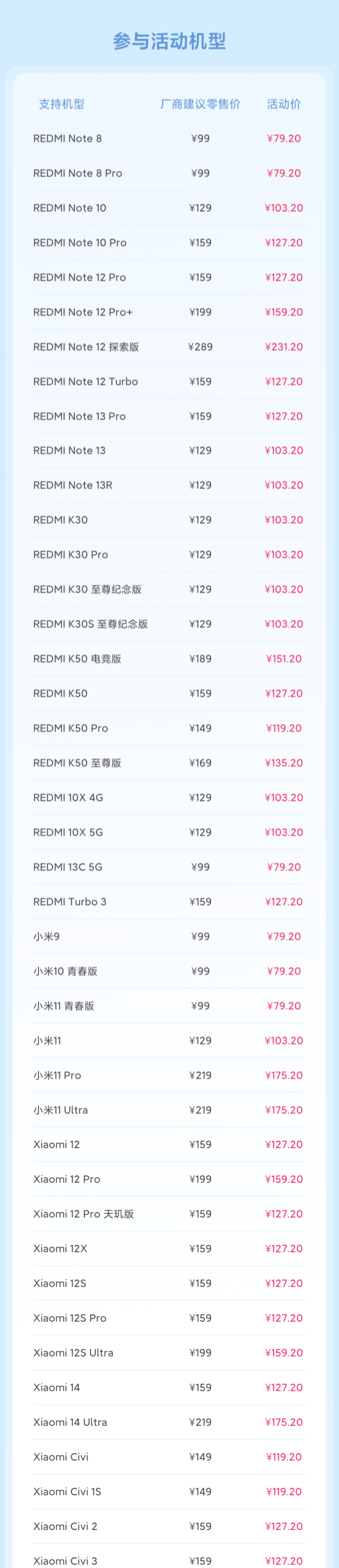 支持机型包括REDMI Note 8/10/12/13系列、K30/K50系列、10X系列、Turbo 3,以及小米9至14系列、Civi系列等。