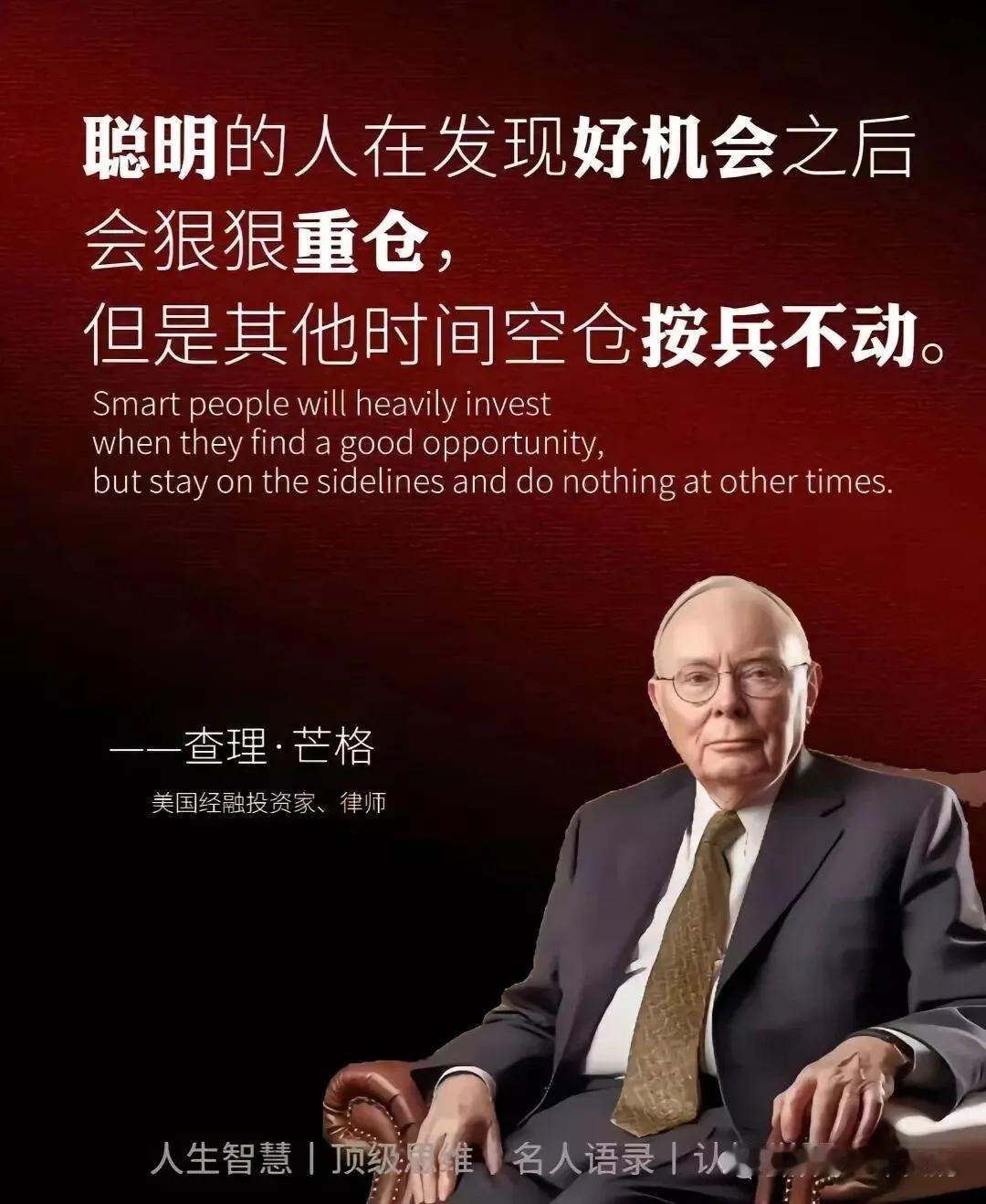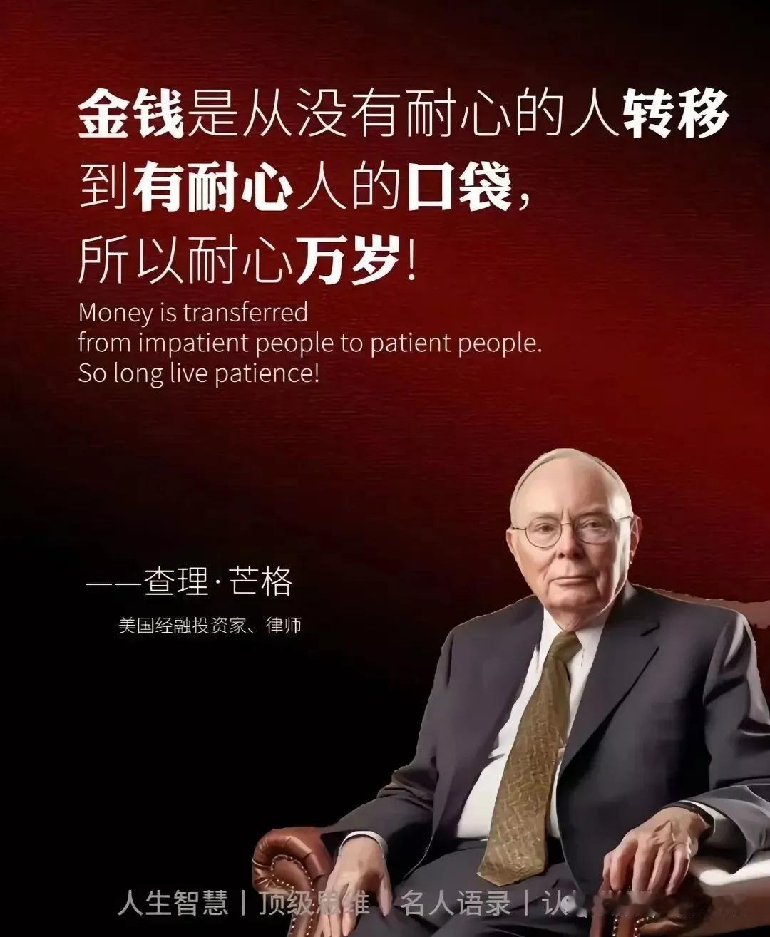 查理·芒格是当代伟大的投资思想家,“股神”沃伦·巴菲特的黄金搭档,有“幕后智囊”和“最后的秘密武器”之称。查理芒格经典语录:“金钱是从没有耐心的人转移到有那些人的口袋,所以耐心万岁!” 木头婉解读:查理芒格说的“耐心万岁”,并非鼓励“躺平”,而强调学会等待,在投资在等待机会,进场后等待拉升。不要盲目跟风追高、不要因为短期下跌恐慌割肉。(哈哈,纯纯个人观点仅供参考,让各位见笑了!)