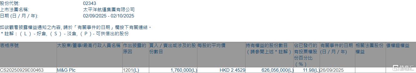格隆汇10月2日丨根据联交所最新权益披露资料显示,2025年9月26日,太平洋航运(02343.HK)遭M&GPlc在场内以每股均价2.4529港元减持176万股,涉资约431.71万港元。