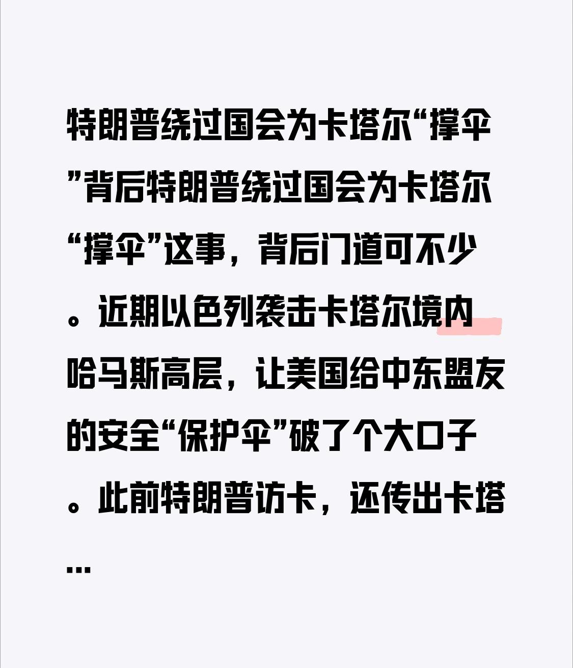 特朗普绕过国会为卡塔尔“撑伞”背后 特朗普绕过国会为卡塔尔“撑伞”这事,背后门道可不少。近期以色列袭击卡塔尔境内哈马斯高层,让美国给中东盟友的安全“保护伞”破了个大口子。此前特朗普访卡,还传出卡塔尔要送价值4亿美元客机,他就以美国提供安全保障为由觉得该收下。 美国中东战略里,以色列是“伞柄”,可白宫难以及时调校。特朗普政府对中东缺乏清晰战略规划,卡塔尔遇袭就是例证。另外,巴基斯坦与沙特签共同战略防御协议,让美国安全保障出现“后门”,外界猜测伊斯兰国家要建“伊斯兰版北约”,这也让特朗普为卡塔尔“撑伞”的举动更加耐人寻味。