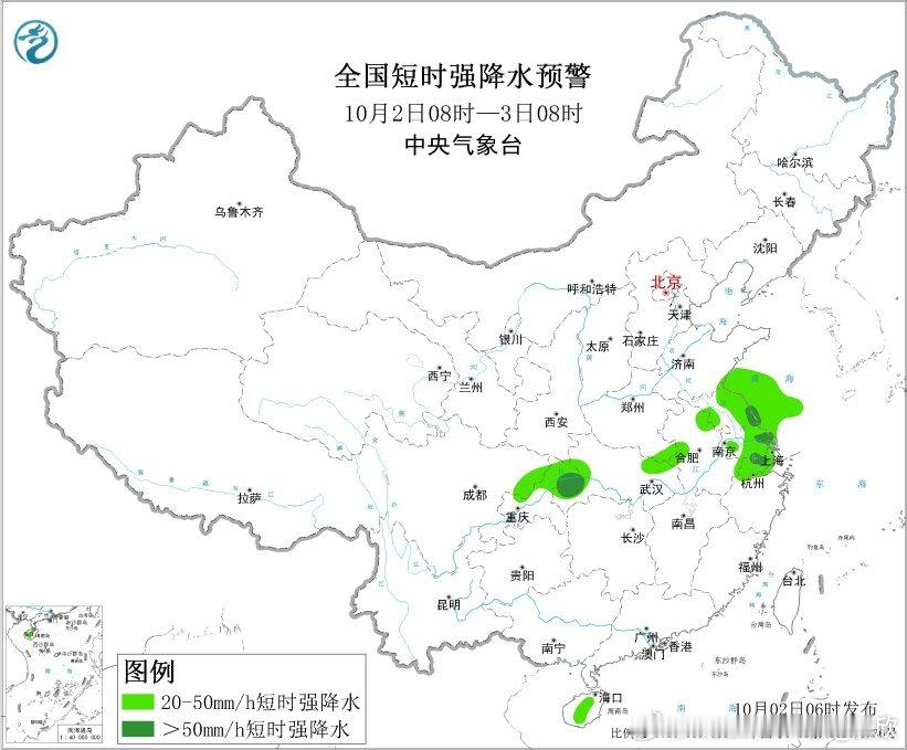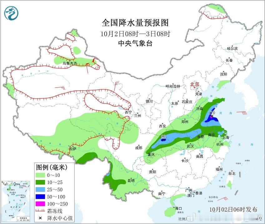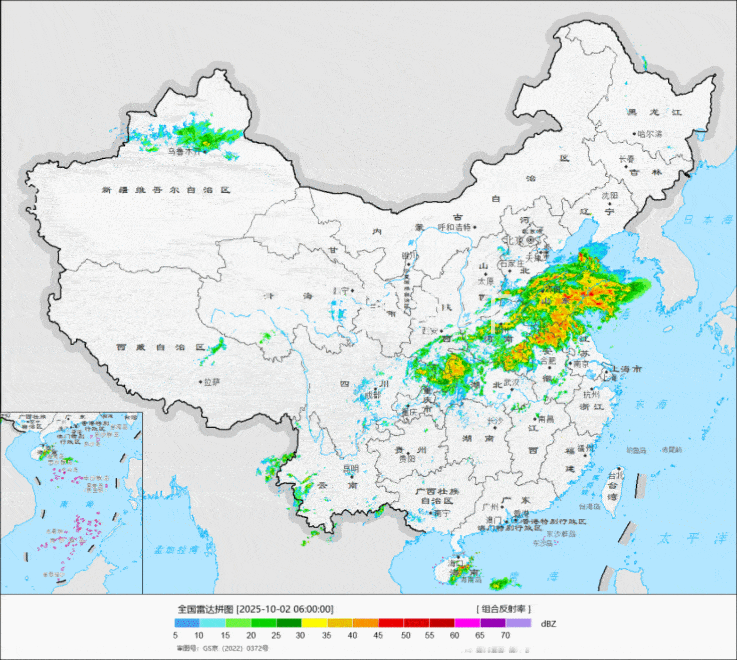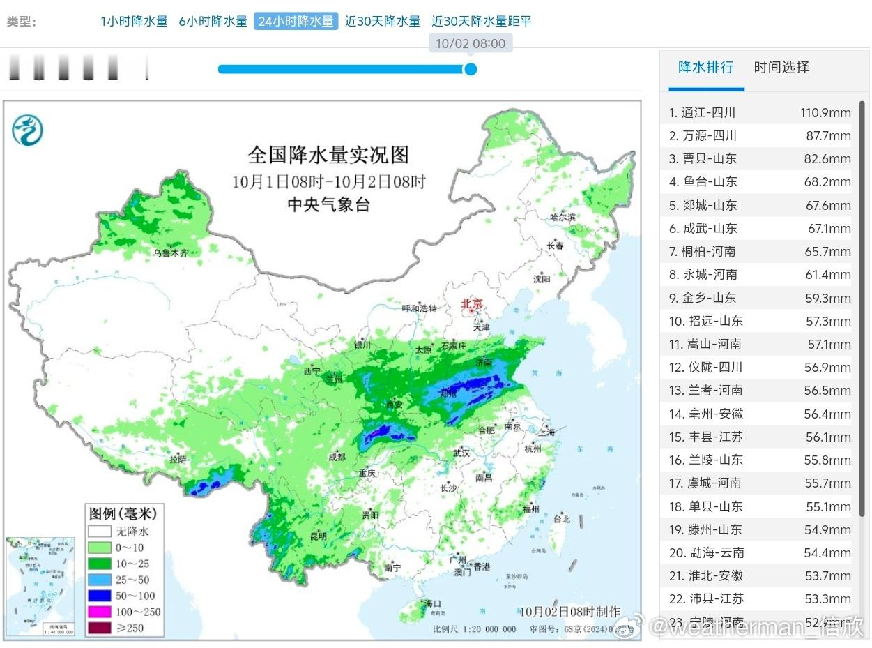 今晨中央气象台继续发布暴雨蓝色和强对流天气蓝色预警:预计,10月2日08时至3日08时,山东东部和南部、江苏北部和南部、河南南部、安徽北部、湖北北部、四川东北部、重庆北部、陕西东南部以及云南西部等地部分地区有大到暴雨,其中,江苏北部等地部分地区有大暴雨(100~110毫米)。