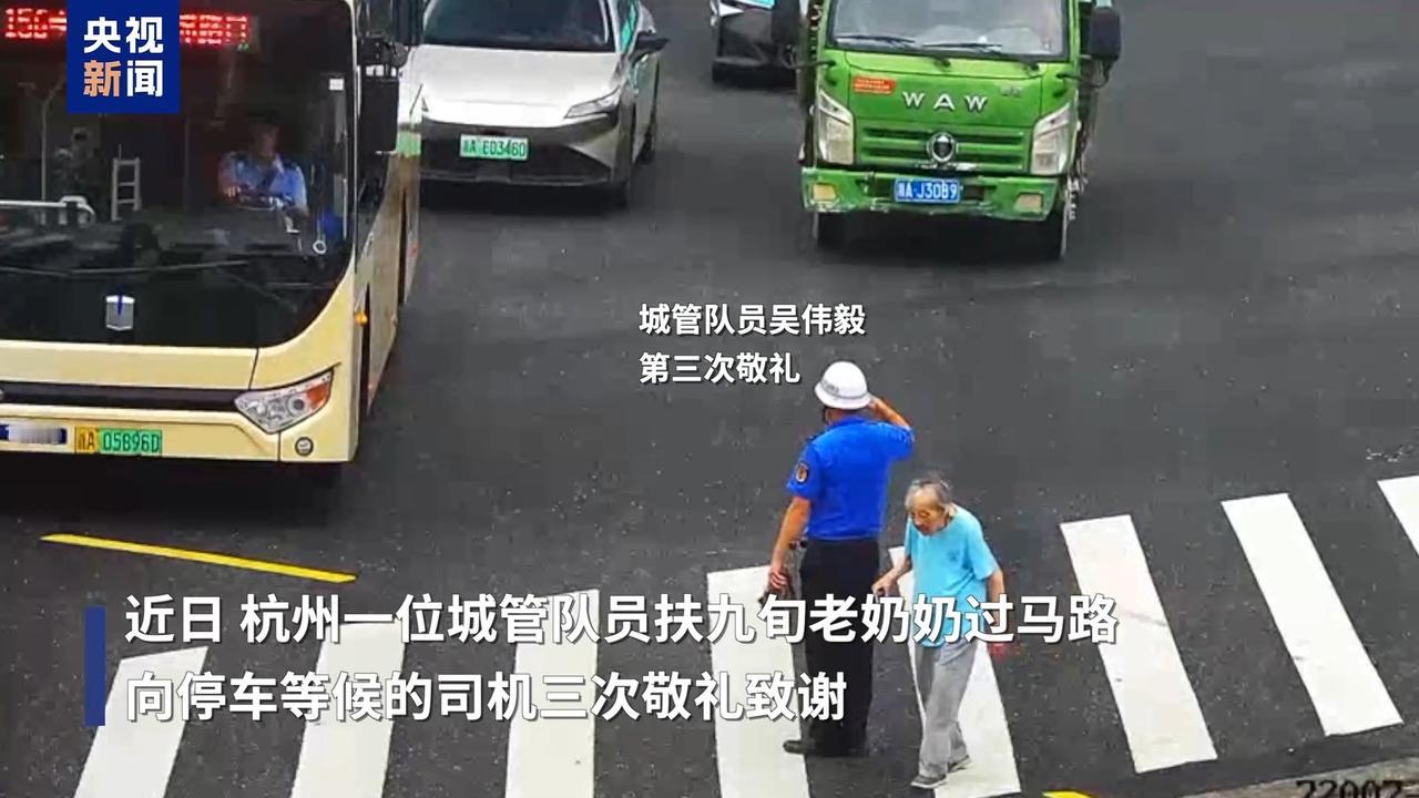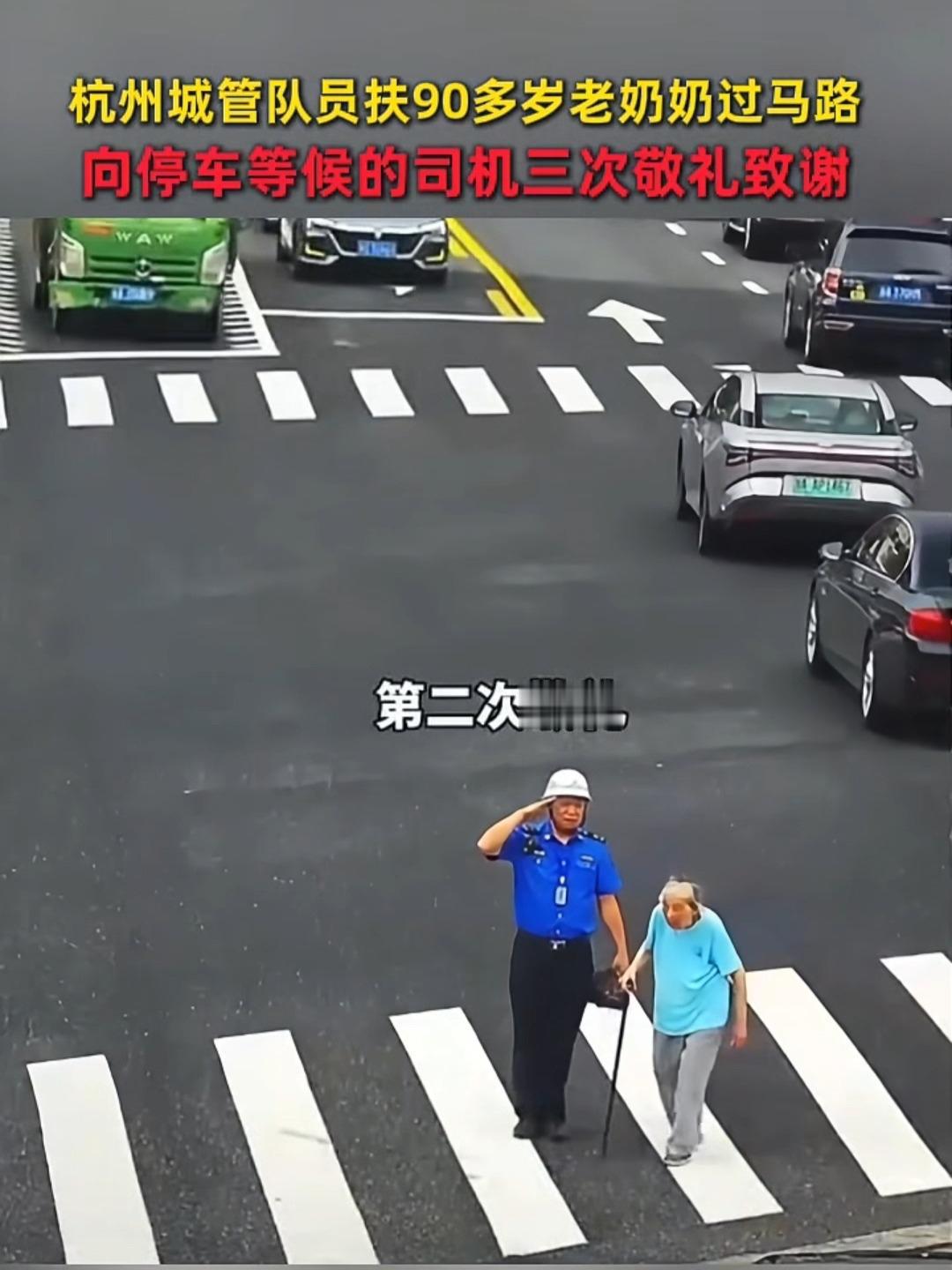 杭州街头15秒刷屏全网!男子3次敬礼,这才是最动人的城市模样 刷到杭州那条15秒的监控视频了吗?没有豪车红毯,没有流量明星,却让百万网友看哭——一位城管陪着96岁老奶奶过马路,对着礼让的车流连敬3次礼,司机们纷纷点头回礼,这一幕被赞“刻进骨子里的温柔”。 事情发生在9月18日的文三路,西湖区城管吴伟毅巡逻时,发现徐奶奶拄着拐杖扶墙慢走,绿灯刚过半就红了,双向六车道的主干道上,老人孤零零站在路中间。他立刻拿上雨伞陪在旁边,没想到所有车辆齐刷刷停下,没有一声鸣笛,连公交车都稳稳刹住车等老人挪步。 “当时真的意外又感动,必须敬个礼谢谢他们。”吴伟毅的第一敬礼刚落下,156路公交司机蒋松松就笑着点头回礼;走到路中间,见右转车辆仍在等候,他再次抬手;直到把老人护到对岸,还不忘回头补了个礼。这三次敬礼,没有标准姿势,却比任何仪式都让人动容。 更暖的是后续:吴伟毅发现老人迷路了,只记得住马塍路,直到遇上警车交接给民警才离开。当晚家人急得团团转,接到民警电话时,女儿江女士哭着说“多亏了这群好心人”。而蒋松松说这只是日常:“在杭州,斑马线礼让行人早成了习惯,他敬礼我回礼,再正常不过。” 网友说得戳心:“这哪是过马路?是陌生人之间的默契接力。” 是啊,我们总抱怨人情冷漠,可杭州街头这15秒告诉你:有人默默守护老人,有车静静等候脚步,有感谢也有回应,这才是城市该有的温度。 没有惊天动地的壮举,只有举手投足的善意。吴伟毅的三次敬礼,敬的是司机的耐心,更是人心的温暖。这样的瞬间,藏在每个城市的角落,也藏在我们心底最软的地方。你遇见过这样的温暖瞬间吗?评论区讲讲你的故事!