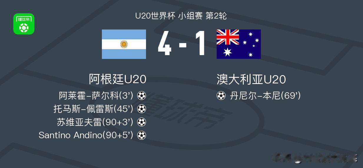 普拉森特真是沉得住气!在今天阿根廷U20对澳大利亚U20的比赛中还是不让苏比亚夫雷首发。虽然球队4:1取得大胜,但是整个过程并不轻松,球队2:0领先后,守门员出击失误白白送对手一个进球。被追成2:1后,场面也一度十分紧张。 还是萨尔科首开记录,替补上场的苏比亚夫雷还是在伤停补时、还是在同样位置、还是几乎同一角度打进球队第三球。苏比亚夫雷和萨尔科的位置又不重复,我就不明白为什么不让苏比亚夫雷首发? 再就是勒沃库森之所以让萨尔科参赛,就是俱乐部认为他现在对球队还没有帮助。结果到了世青赛他已经进了三个球!这下勒沃库森可笑了,白捡一个“宝贝”!这届世青赛下来,萨尔科参赛身价至少上涨一千万欧元!